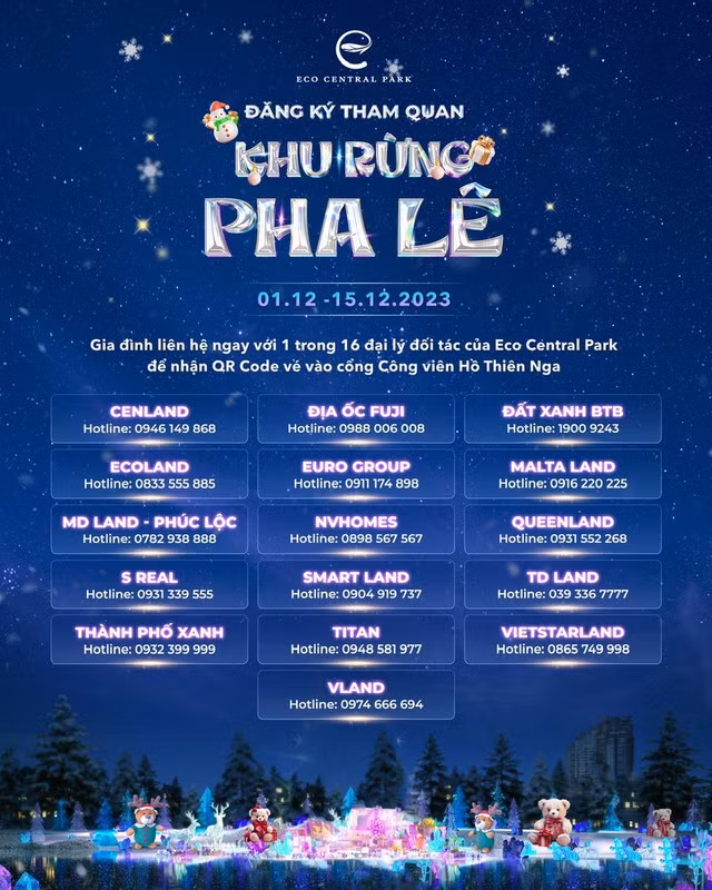 Khu rừng pha lê bên bên công viên Hồ thiên nga Eco Central Park bắt đầu mở cửa từ ngày 1.12 đến 31.12.2023 và hoàn toàn miễn phí. Trong đó từ 1 - 15.12, khách liên hệ qua các đại lý chính thức của dự án Eco Central Park để nhận mã QR code vào cổng.