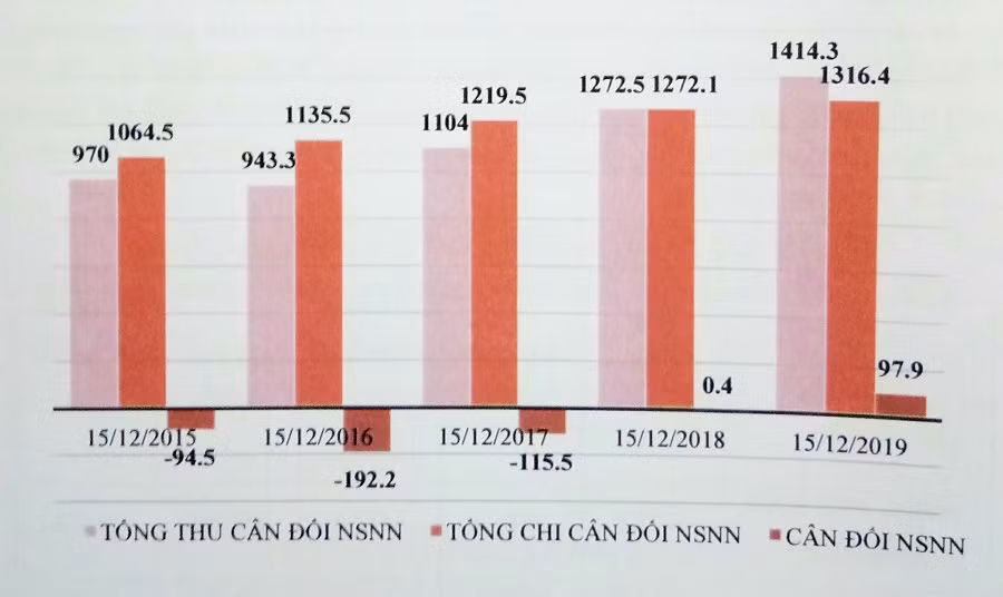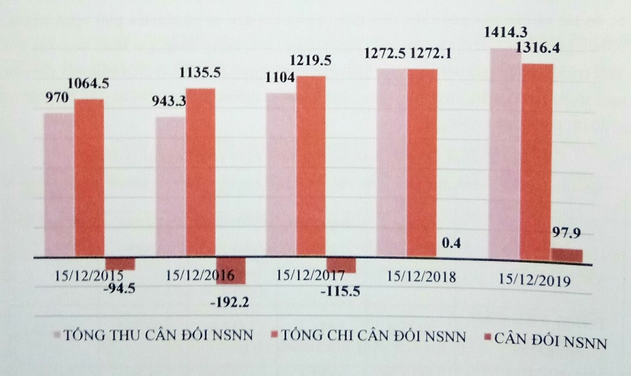 Được biết, cân đối NSNN năm 2019 tiếp tục bội thu và đạt mức cao kỷ lục do tất cả các cấu phần thu đều tích cực và chi đầu tư phát triển giải ngân khá chậm. Tính đến ngày 15/12/2019, cân đối NSNN bội thu 97,9 nghìn tỷ đồng, ghi nhận mức bội thu cao nhất trong 5 năm gần đây tại cùng thời điểm. Thu NSNN tính đến ngày 15/12/2019 ước đạt 1.414,3 nghìn tỷ đồng, tương ứng 100,2% dự toán năm, trong đó thu nội địa vẫn là nguồn thu chiếm tỷ trọng chủ yêu (81%), trong đó thu từ hoạt động xuất nhập khẩu và dầu thô đều vượt dự toán, đóng góp với tỷ lệ lần lượt là 14,9% và 3,8%.