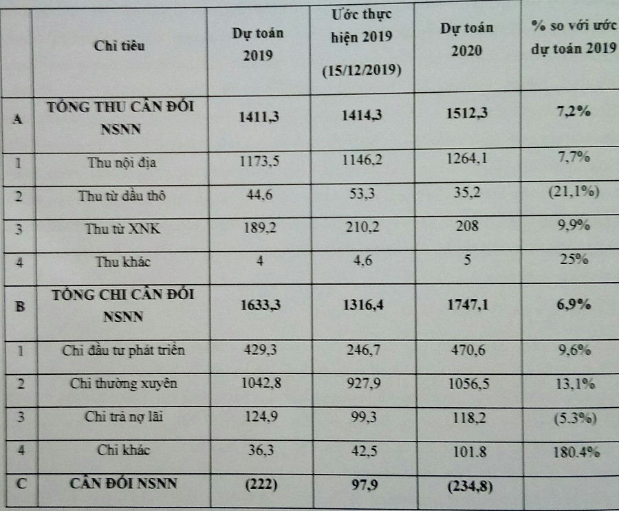 “Dự báo thu NSNN năm 2020 là 1.512,3 nghìn tỷ đồng, tăng 6,9% so với thực hiện năm 2019. Dự báo chi NSNN ở mức 1.747,1 nghìn tỷ đồng, tăng 32,7% so với ước thực hiện 2019. Bội chi của NSNN dự kiến là 3,44% GDP (tương ứng 234,8 nghìn tỷ đồng), trong đó bội chi ngân sách trung ương là 3,2% GDP và bội chi ngân sách địa phương là 0,24% GDP”, PGS.TS Nguyễn Đức Trung, cho biết.