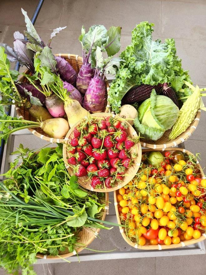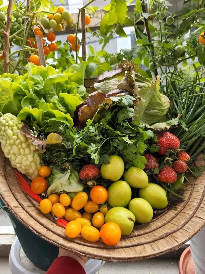Vì trồng mỗi loại một ít và cây nào cũng tươi tốt, cho rau, trái xum xuê nên nhà chị Luy luôn đảm bảo rau ăn quanh năm mà không cần phải mua. “Mấy năm nay không cần đi chợ mua rau hay trái cây. Có đợt thu hoạch hơn 20 kg cà chua bi. Mỗi lần thu hoạch thích lắm, nhiều quá ăn không hết phải chia cho hàng xóm, đồng nghiệp, bạn bè thân thiết. Bình thường mọi người hay mang rau từ quê ra nhưng với nhà mình rau tươi tốt đến mức ăn không hết phải gửi ngược về quê”, chị Luy vui vẻ chia sẻ.