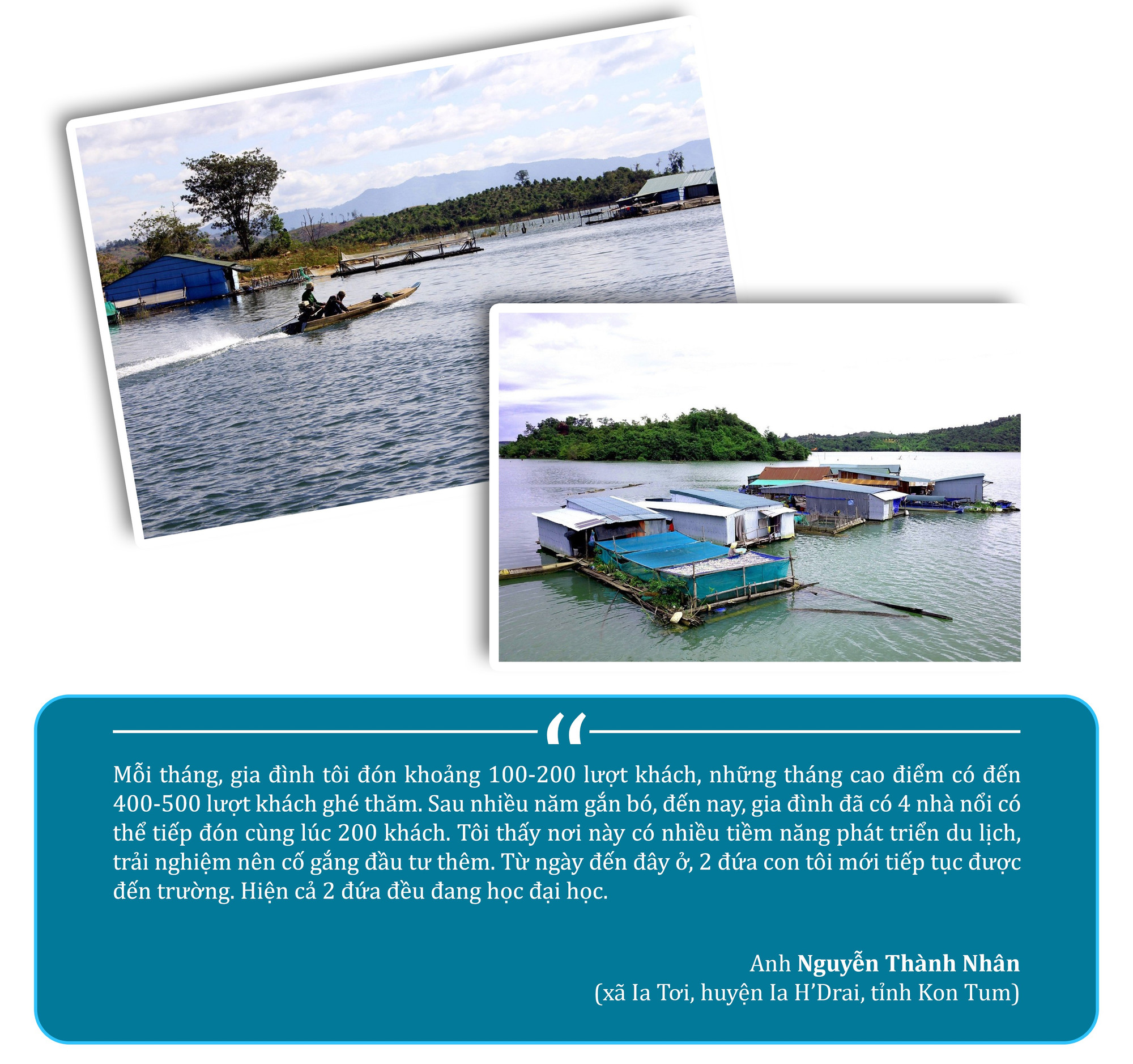 Dân làng chài nay đã đổi vận. Vậy nên, nét vui tươi hiện rõ trong bài vọng cổ người ngư dân vùng sông nước. Vừa dẫn chúng tôi ra tham quan khu vực nhà lồng nuôi cá, anh Thuộc vừa kể: Làng hiện có hơn 30 hộ, đa phần là người An Giang và có quan hệ họ hàng. Ban đầu mới lên, cuộc sống gia đình nào cũng khó khăn nhưng nay thì đỡ nhiều rồi. Từ năm 2018, bà con làng chài nhận được sự quan tâm giúp đỡ của chính quyền tỉnh Kon Tum. Bên cạnh cấp đất, hỗ trợ kinh phí làm nhà ở, hướng dẫn kỹ thuật nuôi trồng thủy sản trên nhà bè, chúng tôi còn được nhập khẩu làm công dân huyện Ia H’Drai và con cái được đến trường học hành. Đặc biệt, những năm gần đây, làng chài trở thành địa điểm hút khách du lịch đến tham quan. Nhờ vậy mà cuộc sống của bà con ngày càng ổn định hơn.