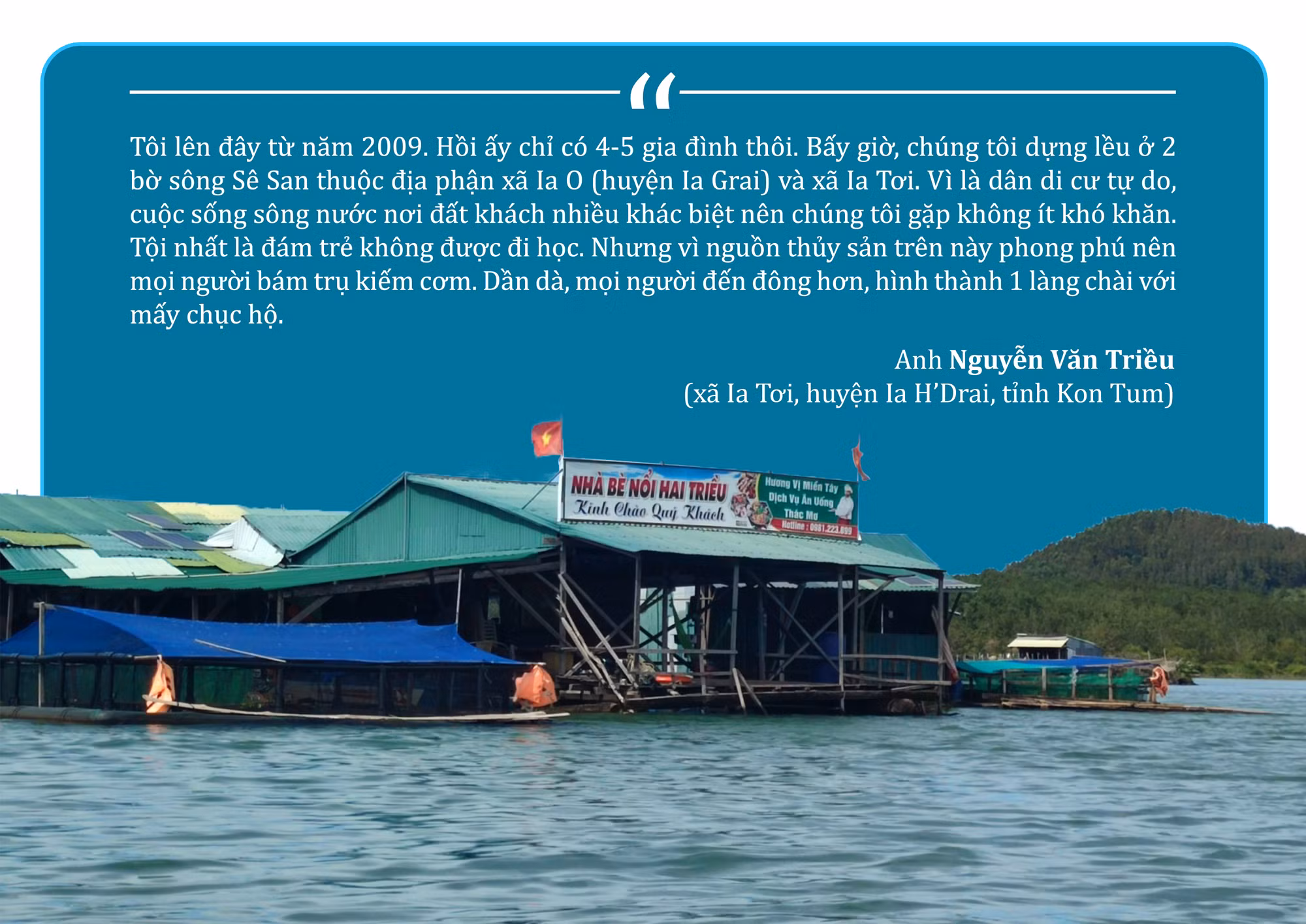 7 năm trước, tôi có dịp đến làng chài trên dòng Sê San. Khi đó, làng có 24 hộ sống trên nhà bè tạm bợ thưng bạt, đáy bằng lồ ô để mưu sinh bằng nghề đánh cá. Nghe nói sông Sê San có cá lăng, anh vũ, mè dinh, nhiều ngư dân di cư lên đây buông câu, thả lưới. Tôi còn nhớ như in lời ông Trần Tằm-một trong những ngư dân đầu tiên đến đây kể chuyện từ tỉnh Thừa Thiên-Huế ngược lên Tây Nguyên mưu sinh: Nhà ông có 6 miệng ăn nên thiếu đói quanh năm. Khi biết sông Sê San đa dạng về các loại thủy sản, vợ chồng ông dắt nhau lên đây mưu sinh từ năm 2009. Ông gửi 4 đứa con cho người thân ở quê trông giúp. Mỗi đêm buông lưới thu về 200-300 ngàn đồng, hơn đứt khi còn ở Huế. Thậm chí, những năm đầu mới lên, có khi còn đánh bắt được cá to, nặng đến 30-40 kg, bán được tiền triệu. Nhờ vậy mà cuộc sống gia đình ổn định hơn.
