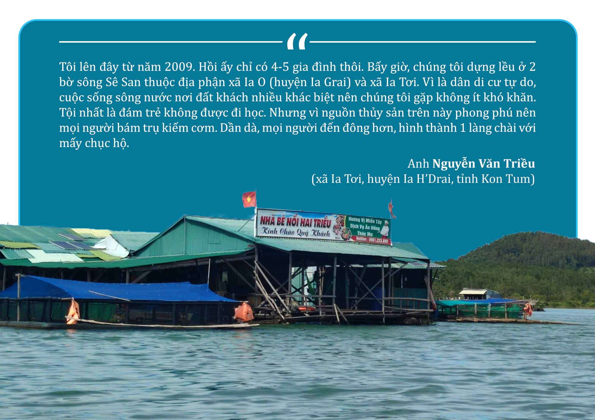 Hành trình đến với con nước Sê San của gia đình anh Nguyễn Văn Triều (quê ở tỉnh An Giang) và hơn chục hộ người cùng quê cũng không khác gia đình ông Trần Tằm. Tiếng đồn về thủy sản phong phú đã khiến họ tìm đến nơi này. Khi mới lên, nhà nào cũng nghèo, thiếu thốn đủ thứ.