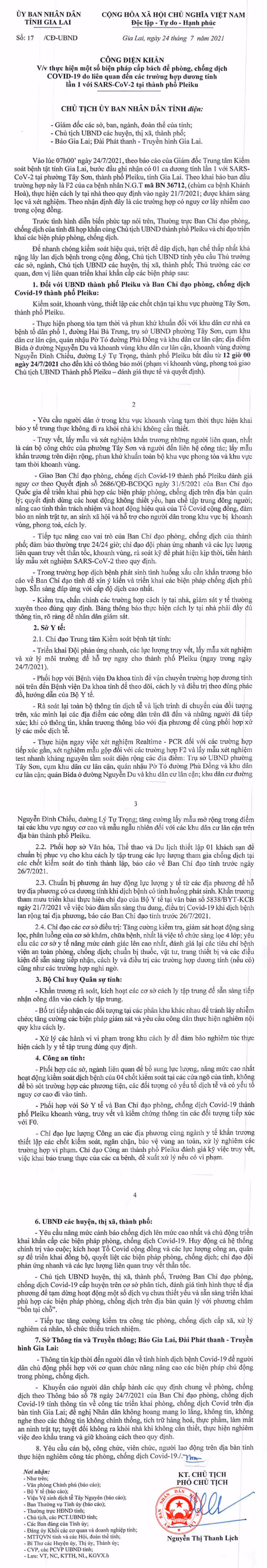 (GLO)- Ngày 24-7, UBND tỉnh Gia Lai có Công điện khẩn số 17/CĐ-UBND về việc thực hiện một số biện pháp cấp bách để phòng-chống dịch Covid-19 do liên quan đến các trường hợp dương tính lần 1 với SARS-CoV-2 tại TP. Pleiku.