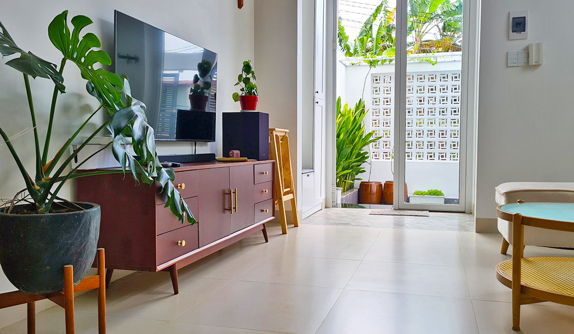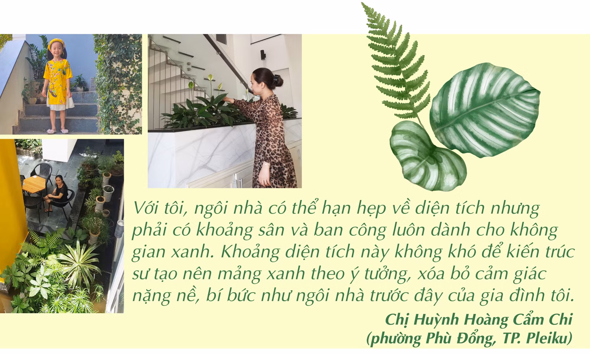 Chị Chi cho hay: “Mỗi người đều có một ước mơ đẹp cho cuộc sống của mình. Với tôi, ước mơ là mỗi ngày được dành thời gian chăm sóc cây xanh. Dù nhà ở mặt phố nhưng tôi quyết định lùi vào 2,5 m, dành khoảng trống để trồng cây xanh, giúp các phòng đón nhiều ánh sáng tự nhiên”.