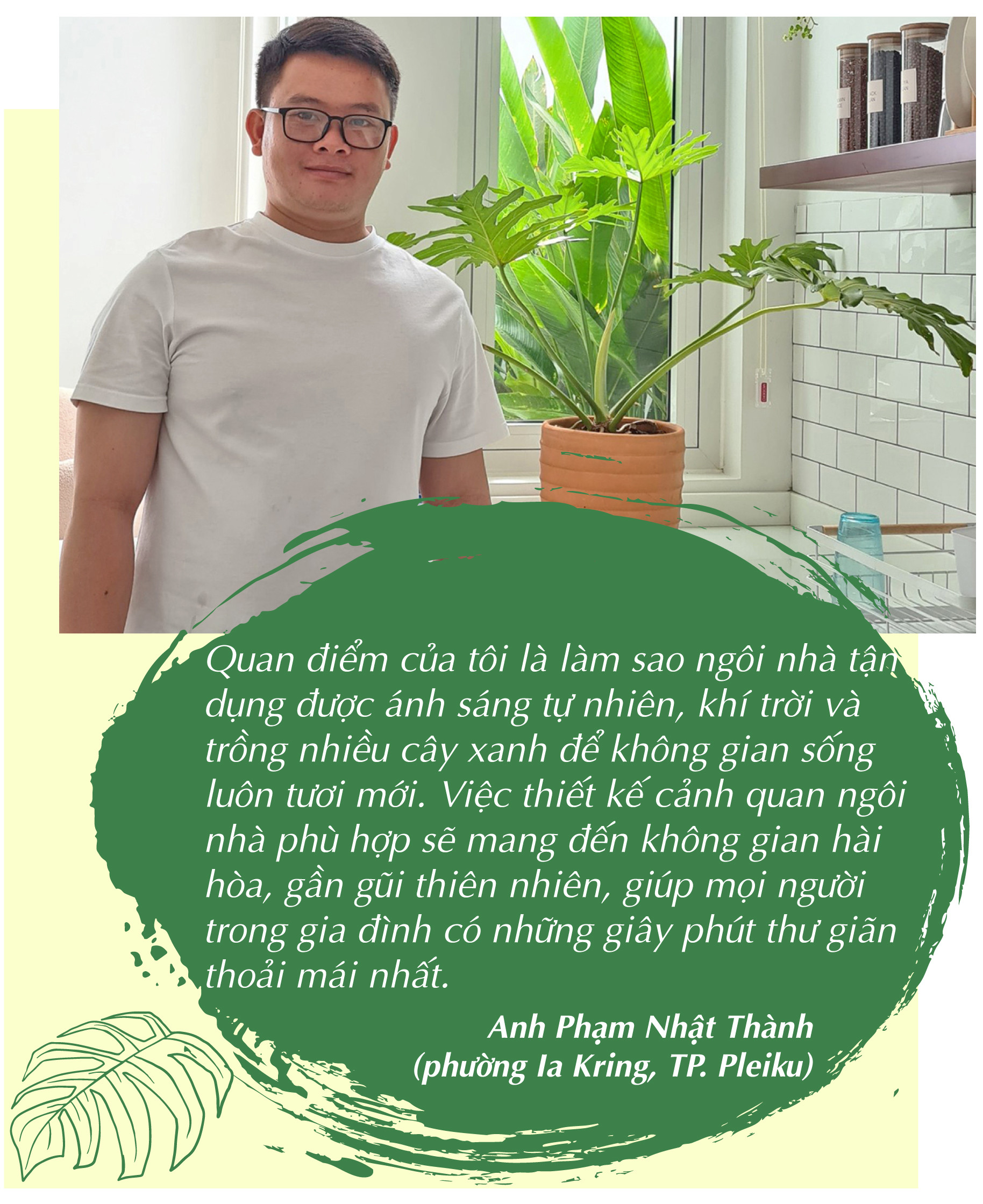 Mang thiên nhiên vào nhà ở đang là xu hướng nổi bật trong quá trình thiết kế nhà ở cũng như nội thất. Để minh chứng cho điều này, chúng tôi tìm đến nhà anh Phạm Nhật Thành. Ngôi nhà có diện tích 100 m2 nằm sâu trong hẻm 260 Lê Thánh Tôn (phường Ia Kring) với tổng kinh phí xây dựng khoảng 750 triệu đồng được thiết kế theo phong cách hiện đại. Từ chậu cây xanh, bộ bàn ghế, góc bếp… đều được bài trí rất hài hòa, nghệ thuật.