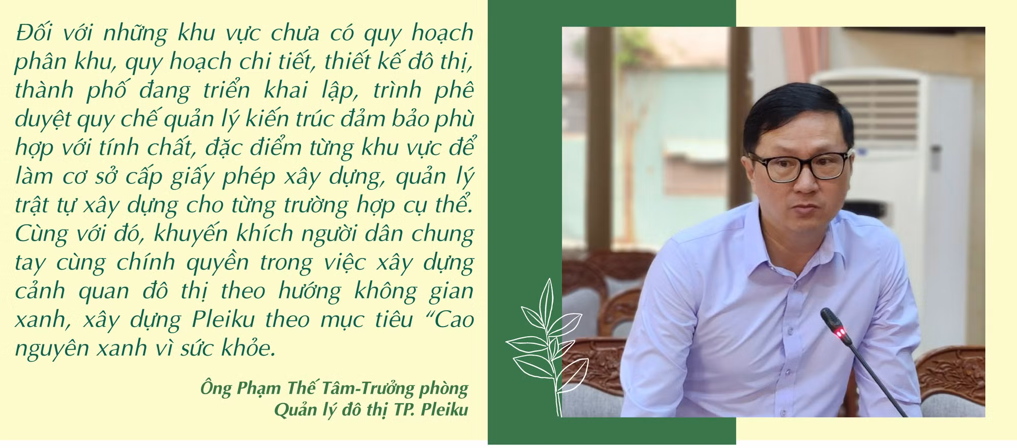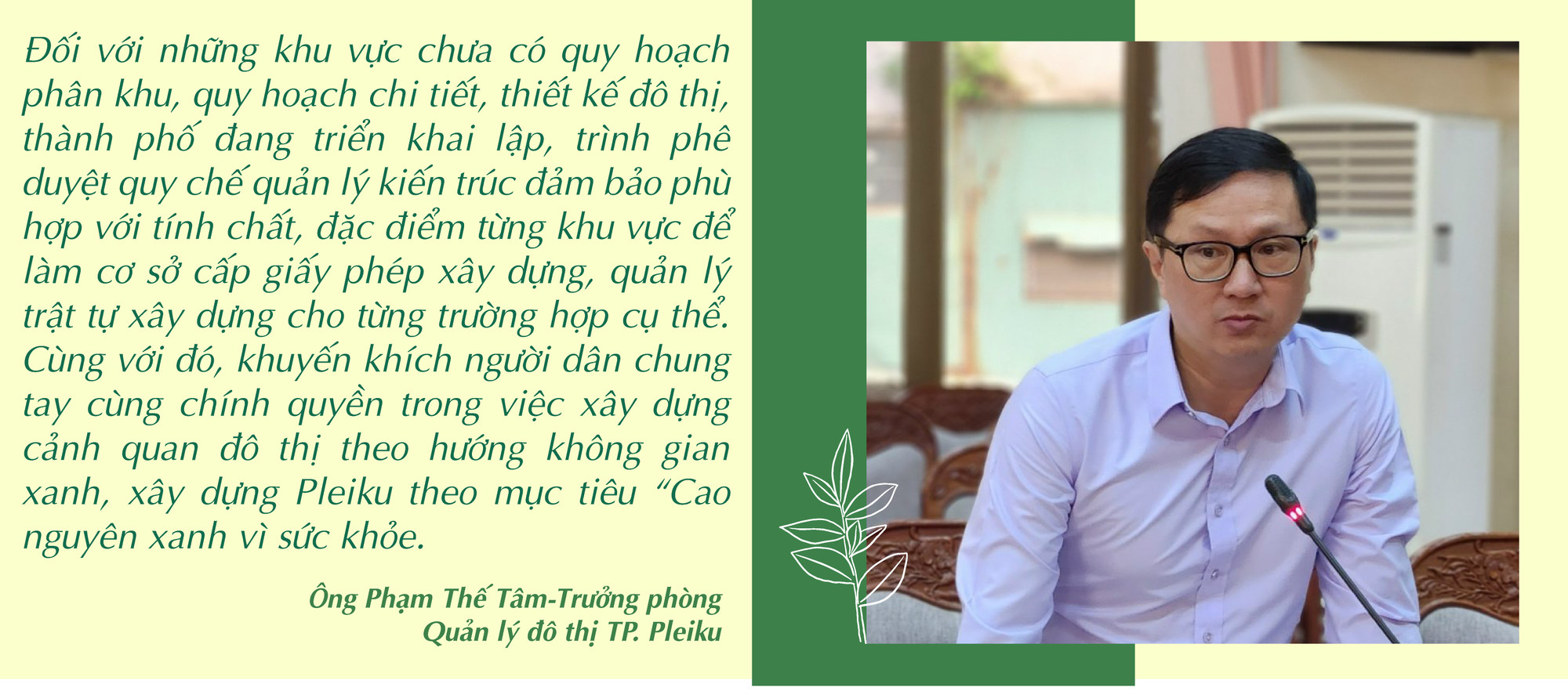 Trao đổi với P.V, ông Phạm Thế Tâm-Trưởng phòng Quản lý đô thị TP. Pleiku-cho hay: Hiện nay, thành phố định hướng phát triển trở thành đô thị “Cao nguyên xanh vì sức khỏe”, đảm bảo môi trường sống trên cơ sở tôn trọng hiện trạng; đồng thời tạo dựng các khu vực công cộng đô thị đáp ứng nhu cầu sinh hoạt của dân cư, thích hợp với đặc trưng khí hậu, thổ nhưỡng của vùng Tây Nguyên. Định hướng đó là “kim chỉ nam” trong đồ án điều chỉnh quy hoạch chung xây dựng thành phố định hướng đến năm 2030, tầm nhìn đến năm 2050. Nhằm cụ thể hóa chủ trương này, UBND thành phố đang triển khai lập đồ án quy hoạch các phân khu làm cơ sở quản lý đất đai, quản lý xây dựng, định hướng các không gian công cộng, không gian xanh theo từng khu vực, đảm bảo phục vụ lợi ích cho tất cả người dân trên địa bàn. Đối với công tác quy hoạch đô thị, thành phố đặt yếu tố xanh lên hàng đầu. Bởi không gian xanh đô thị không chỉ có cây xanh đường phố, công viên mà cần có cái nhìn toàn diện hơn bao gồm: các hành lang xanh, vành đai xanh, nhà ở dân cư xanh…