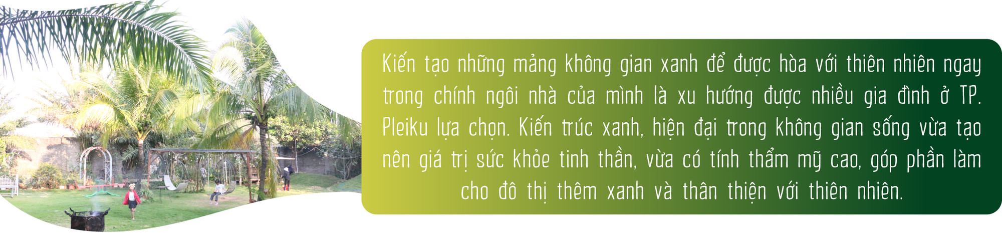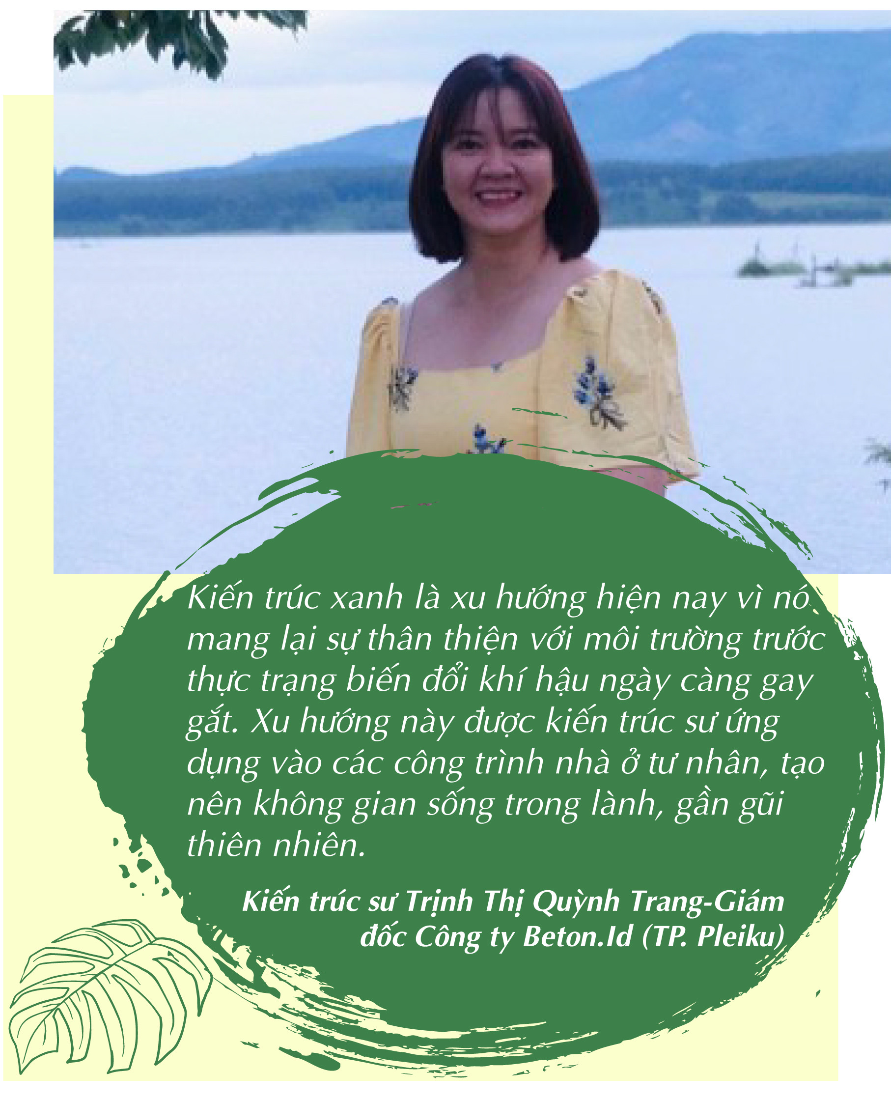 Về vấn đề này, kiến trúc sư Trịnh Thị Quỳnh Trang-Giám đốc Công ty Beton.Id (TP. Pleiku) cho biết: Bên cạnh việc ưu tiên công trình có nhiều cây xanh thì loại hình kiến trúc này còn sử dụng nhiều vật liệu gần gũi với môi trường, tận dụng tối đa nguồn ánh sáng và luồng không khí tự nhiên. Từ đó làm giảm thiểu mức tiêu thụ năng lượng, tạo ra không gian sinh hoạt nhiều tiện ích, thân thiện với môi trường.