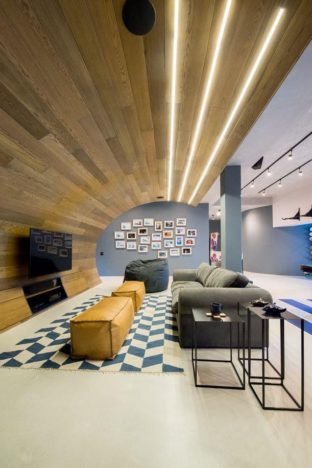 Nhằm để phân biệt không gian phòng khách với các không gian hiện đại bên trong căn hộ, các kiến trúc sư đã thiết kế mái vòm khu vực phòng khách này mang hình thù lằn sóng trượt cong lượn. Chúng làm từ bê tông, cốt thép rất chắc chắn và chịu lực tốt.