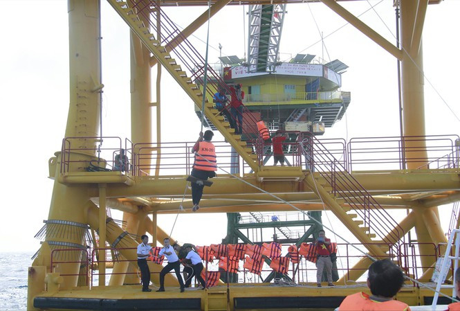 Đại biểu nhà báo, phóng viên leo thang dây lên Nhà giàn DK1/16. Ảnh: Trường Phong