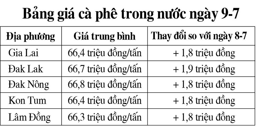 Cụ thể, sau khi điều chỉnh tăng 1,8 triệu đồng/tấn, giá cà phê tại tỉnh Gia Lai và Kon Tum cùng ở mức 66,4 triệu đồng/tấn.