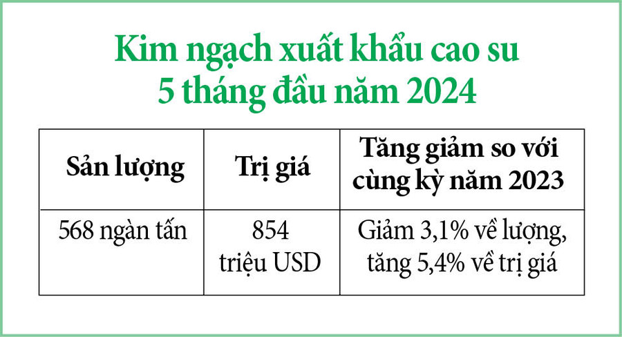 Tính chung 5 tháng đầu năm 2024, Việt Nam đã xuất khẩu 568 ngàn tấn cao su, trị giá 854 triệu USD (giảm 3,1% về lượng nhưng tăng 5,4% về trị giá so với cùng kỳ năm 2023).