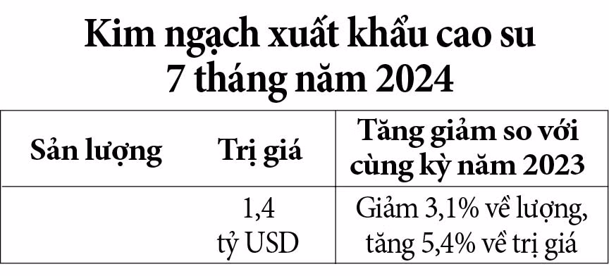 Tính chung 7 tháng năm 2024, Việt Nam đã xuất khẩu gần 913 ngàn tấn cao su, trị giá 1,4 tỷ USD (giảm 7,5% về lượng nhưng tăng 5,9% về trị giá so với cùng kỳ năm 2023).