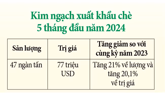 Tính chung 5 tháng đầu năm, Việt Nam đã xuất khẩu 47 ngàn tấn chè, trị giá 77 triệu USD (tăng 21% về khối lượng và tăng 20,1% về giá trị so với cùng kỳ năm 2023).