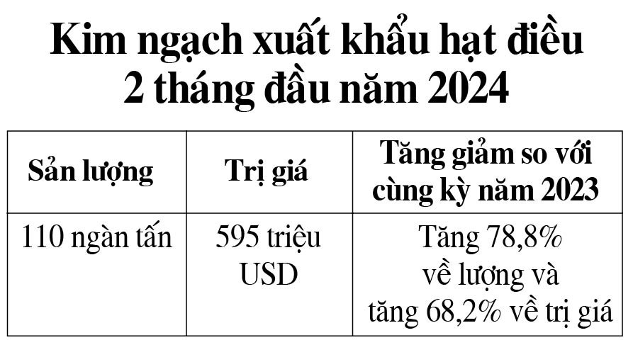 Tính chung cả 2 tháng đầu năm 2024, Việt Nam đã xuất khẩu 110 ngàn tấn hạt điều, trị giá 595 triệu USD (tăng 78,8% về lượng và tăng 68,2% về trị giá so với cùng kỳ năm 2023).