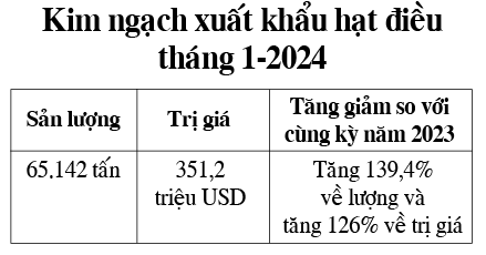 Giá xuất khẩu hạt điều của Việt Nam trong tháng 1-2024 đạt 5.391 USD/tấn (giảm 5,6% so với cùng kỳ năm 2023).