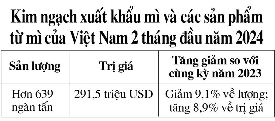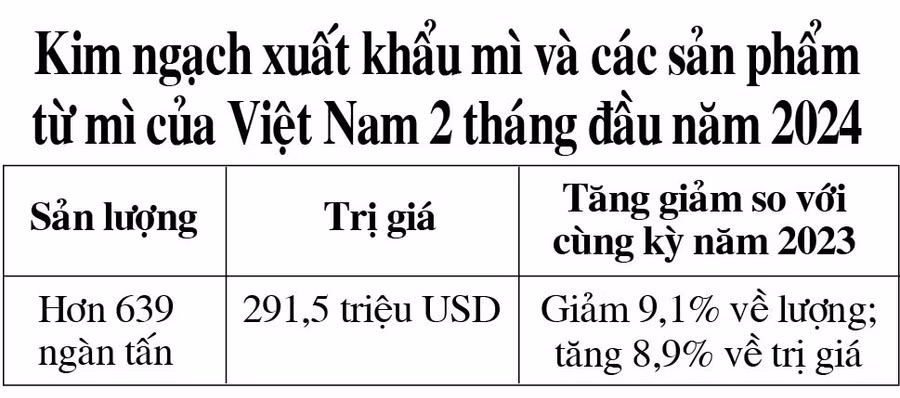 Tính chung 2 tháng đầu năm 2024, Việt Nam đã xuất khẩu hơn 639 ngàn tấn mì và các sản phẩm từ mì, trị giá 291,5 triệu USD (giảm 9,1% về lượng nhưng tăng 8,9% về trị giá so với cùng kỳ năm 2023), theo congthuong.vn.