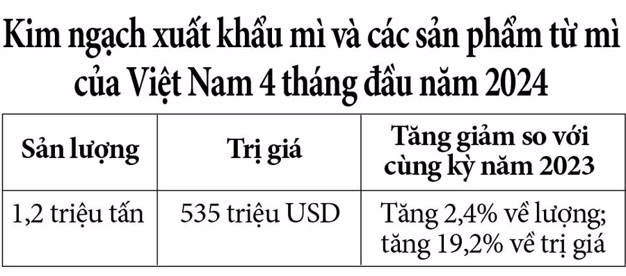 Tính chung 4 tháng đầu năm 2024, Việt Nam đã xuất khẩu 1,2 triệu tấn mì và các sản phẩm từ mì, trị giá 535 triệu USD (tăng 2,4% về lượng và tăng 19,2% về giá trị so với cùng kỳ năm 2023).