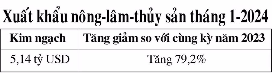 Bộ Nông nghiệp và PTNT cho hay, hầu hết giá các mặt hàng xuất khẩu trong tháng 1-2024 đều tăng. Đáng chú ý, mặt hàng chè búp, chè móc câu tăng 19-30%; ớt chuông tăng 33%; hạt tiêu đen tăng 5%; cà phê tăng 4-9%; gạo tăng trên 6%; xoài cát chu tăng 8%; thanh long tăng 3,4-4,5%; tôm nguyên liệu tăng 4%; cá nguyên liệu tăng 5-6,7%.