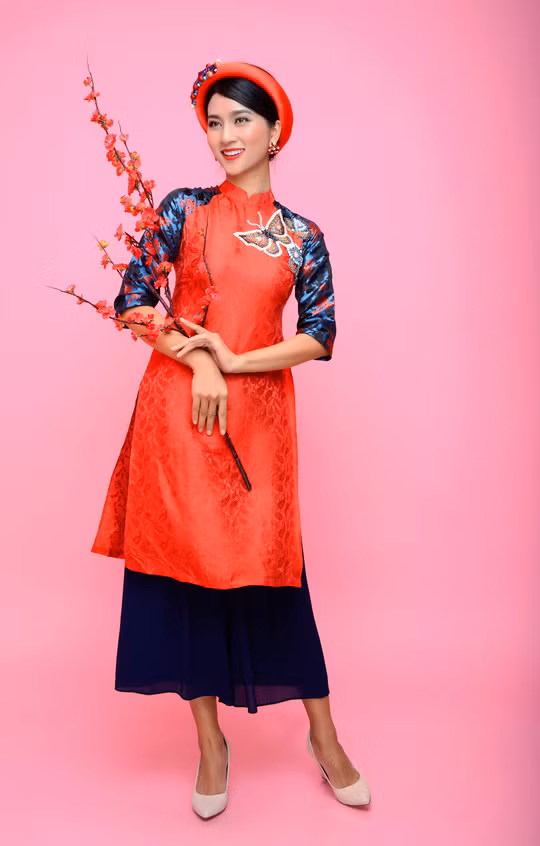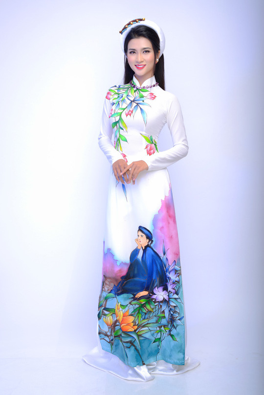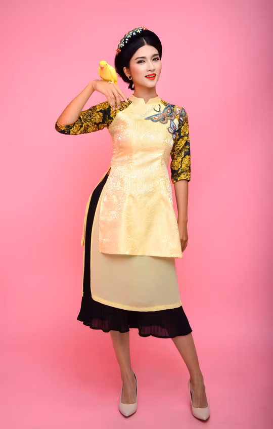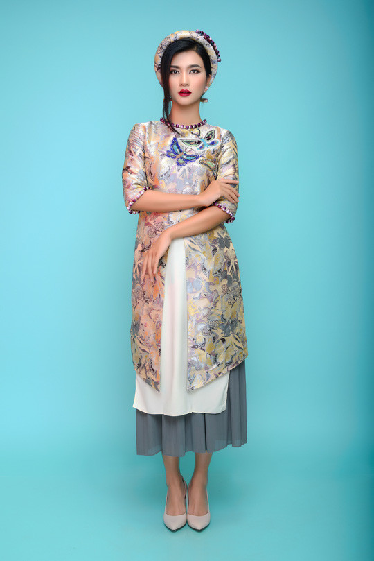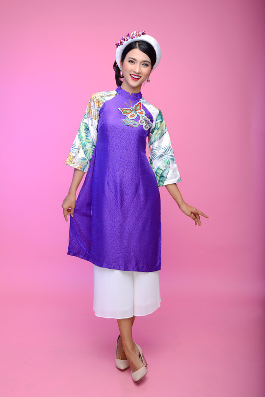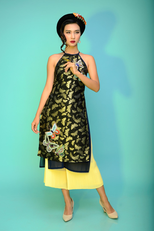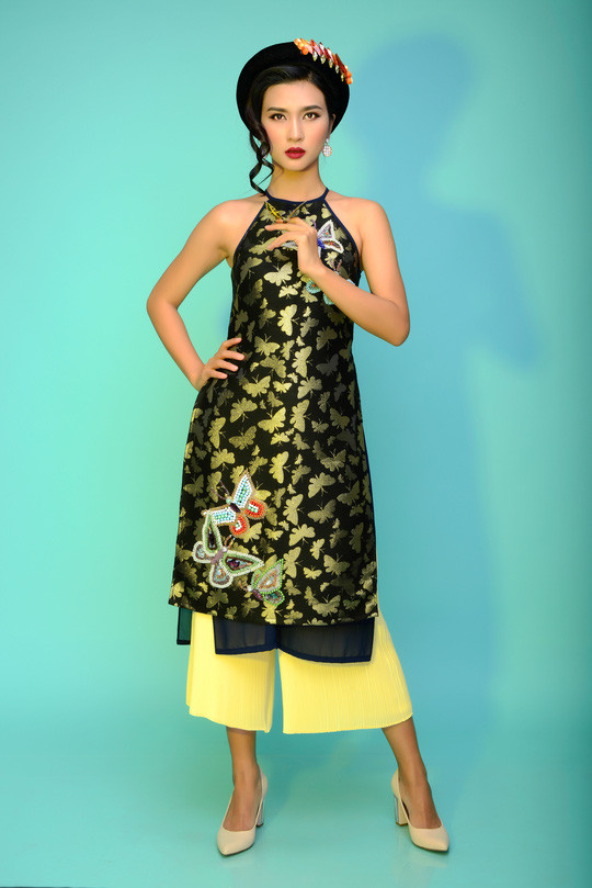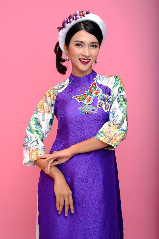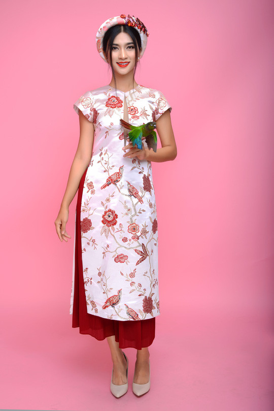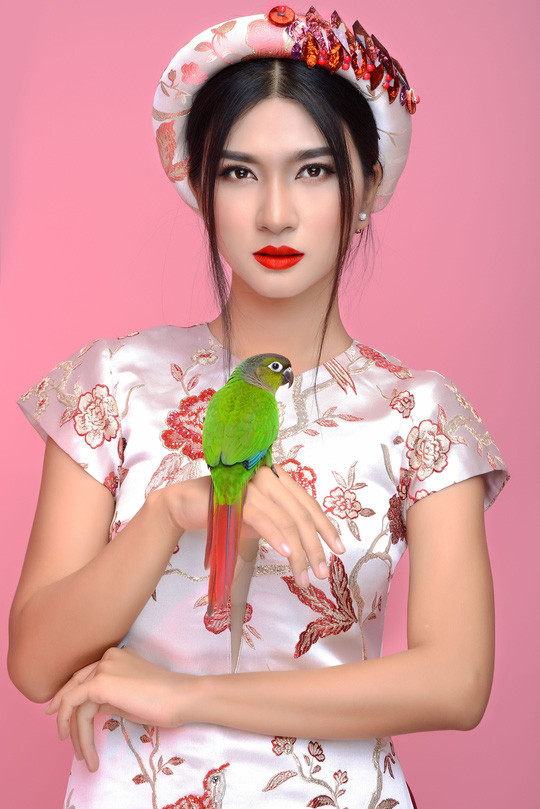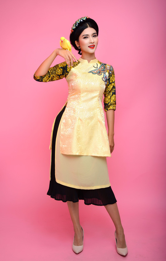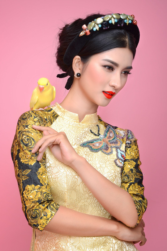 Kim Tuyến khoe vẻ đẹp cuốn hút của mình với loạt áo dài của nhà thiết kế Minh Châu. Phối diễn cùng nữ diễn viên này trong loạt ảnh là hai “bạn diễn” đặc biệt chim và bướm.