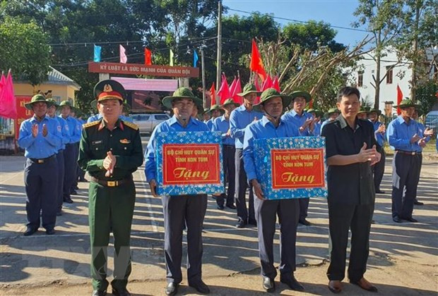 | Lãnh đạo Bộ Chỉ huy Quân sự tỉnh Kon Tum tặng quà cho đội K53 lên đường làm nhiệm vụ. Ảnh: Cao Nguyên/TTXVN |