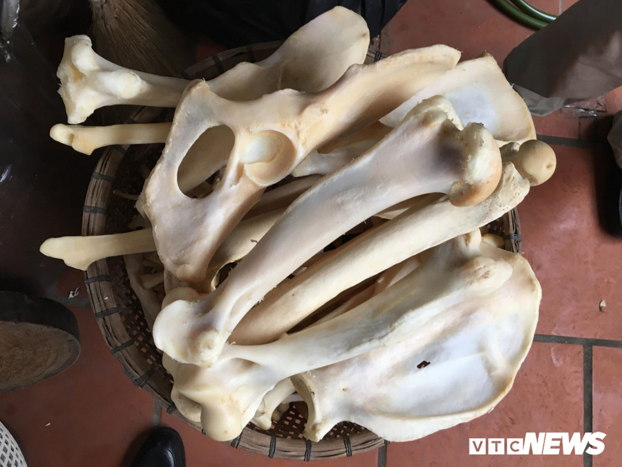 Ông chủ M lớn giọng sai một thợ già da dẻ bóng nhẫy gân guốc lên trên nhà sàn vác một bao tải xuống. Rạch toang miệng bao, thì lộ ra cả đống xương. Nhóm này giải thích đó là xương sơn dương, xương ống khỉ, xương rùa, vài cái nhung hươu. Những thứ xương này sẽ nấu cùng cốt hổ.