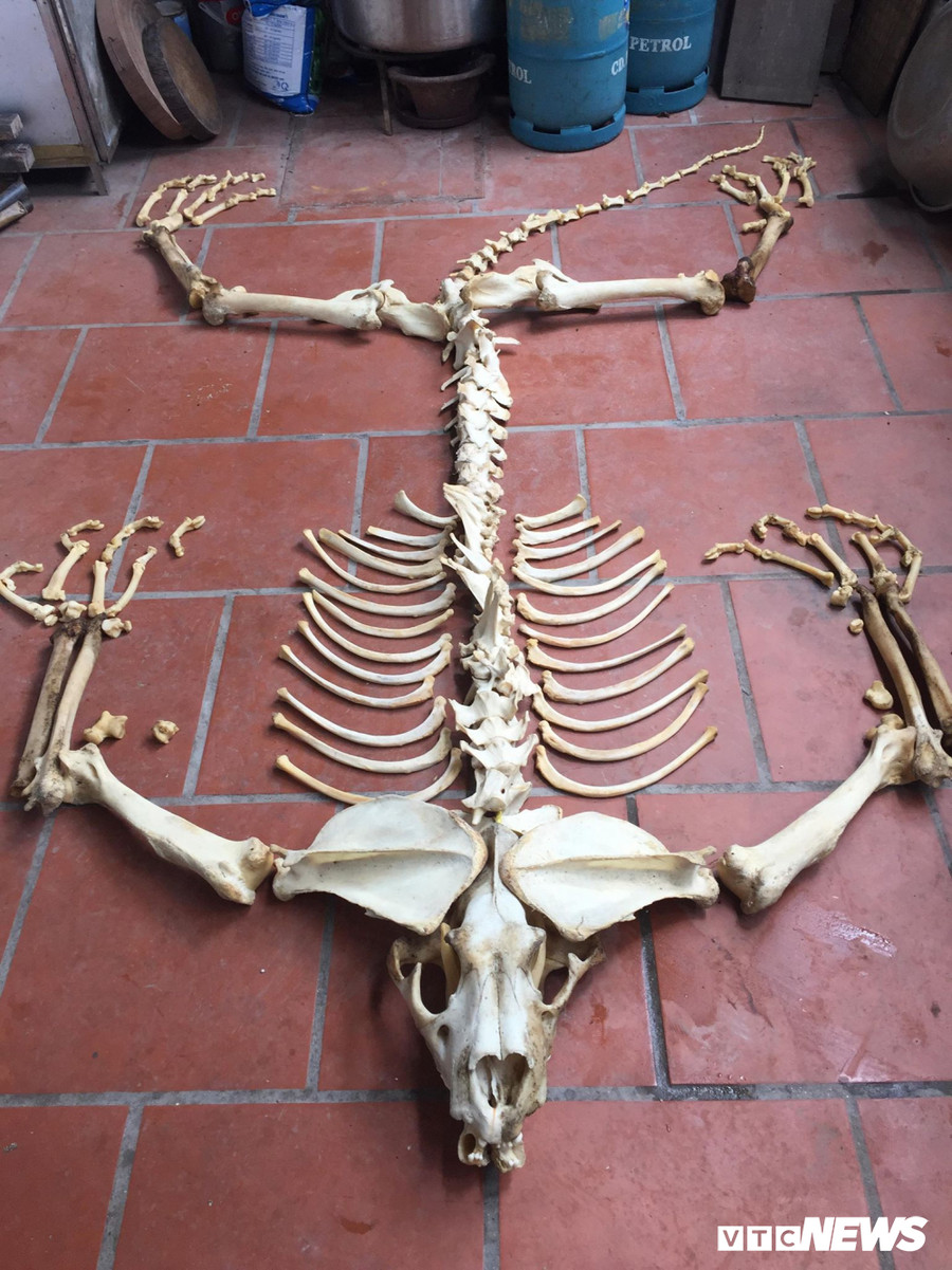Một thợ cầm chiếc dao rựa bản to, dày cộp nặng đến vài kg sắt chặt phầm phập đến chục nhát, đầu chúa sơn lâm mới chịu rời khỏi bộ xương trơ. Chỉ nhoáng một cái, đống xương đã đâu ra đấy, mỗi người một việc, mỗi người một khúc xương cọ rửa. Mùi gây hôi rất đặc trưng của hổ tạo cảm giác ghê ghê, rờn rợn.