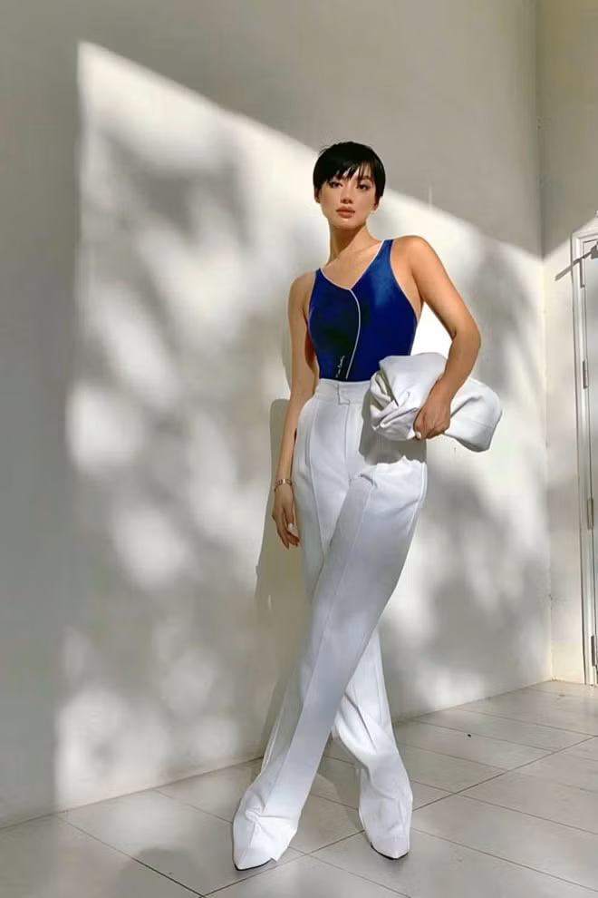 Khánh Linh nổi tiếng với gu ăn mặc thời thượng giúp tôn vóc dáng của chính mình. "Cô Em Trendy" lựa chọn chiếc bodysuit xanh navy độc đáo, quần cạp cao màu trắng và đôi giày cao gót mũi nhọn cùng tông khiến chân dài càng thêm "miên man". Cô phối với phụ kiện từ nhà mốt Bottega Veneta sành điệu từng xuất hiện nhiều trên đường phố thời trang năm nay.