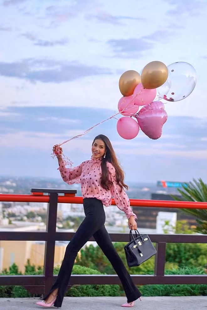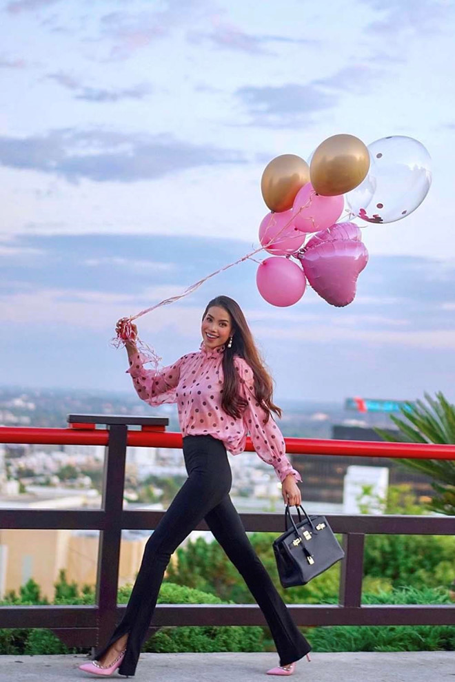 Hoa hậu Phạm Hương khoe sắc trên đất Mỹ với màu hồng nổi bật vào ngày sinh nhật. Cô diện một chiếc áo nhún bèo ở cổ và tay áo màu hồng chấm bi bắt mắt, phối cùng quần cạp cao ống loe với đường xẻ ở gấu quần giúp đôi chân cô thêm phần nổi bật mà vẫn khéo léo khoe được đôi giày từ nhà mốt Valentino trị giá 845 USD và chiếc túi Hermes nổi đình đám. Những ai theo dõi cô chắc hẳn đều nhận ra sở thích sưu tầm phụ kiện đắt tiền giống nhau nhưng khác màu.