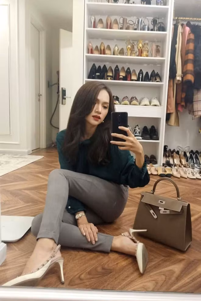 Hương Giang lựa chọn trang phục công sở nhưng cũng không kém phần tinh tế. Những items cơ bản như áo dài tay nữ tính và quần vải công sở, cô phối cùng cao gót đinh tán "huyền thoại" của nhà mốt Valentino, phụ kiện xách tay đến từ thương hiệu sang chảnh Hermes.