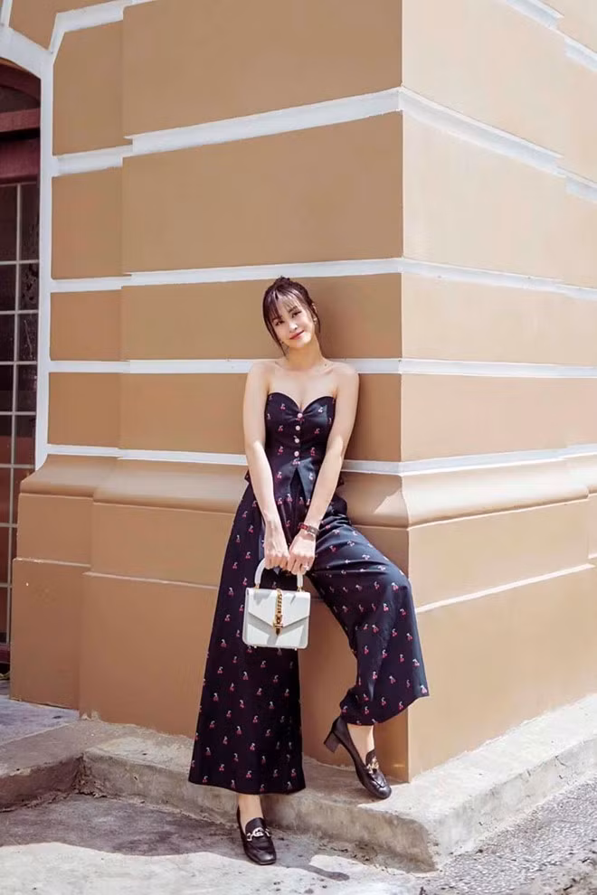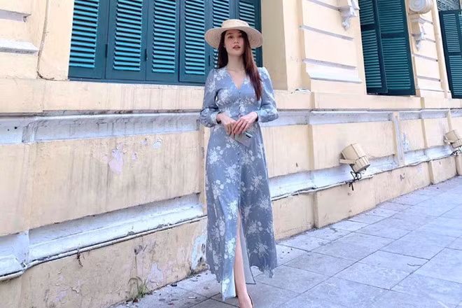 Diễm My 9X xuất hiện trên đường phố với set đồ thướt tha nữ tính. Cô lựa chọn váy hoa màu pastel nhẹ nhàng, cổ V cùng tay áo bồng và hàng khuy phía trước tạo cảm giác gần gũi hơn khi đi dạo phố. Nữ diễn viên khéo léo kết hợp phụ kiện mũ cói rộng vành để bảo vệ làn da.