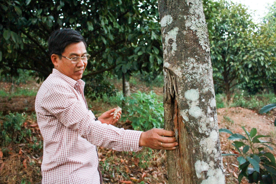 Ông Trần Quang Đông đang kiểm ra trầm hương trên một cây dó bầu. (Ảnh: Phạm Ly).