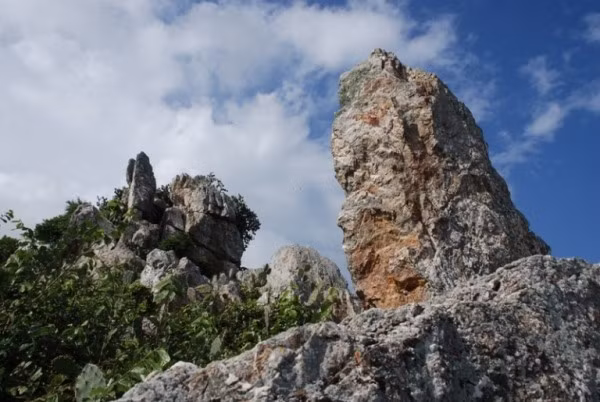 Đỉnh ở phần đầu núi, khối đá xếp dựng cao hơn 10 m như một pháo đài, có hai hòn đá nhọn kề nhau, xiên ngược lên như một cặp “xương ngạnh” trên đầu cá, trông lạ và hùng tráng. Dần về phía dưới là những đỉnh đá lô nhô như những chiếc xương nhọn, in trên nền xanh là những cánh đồng.