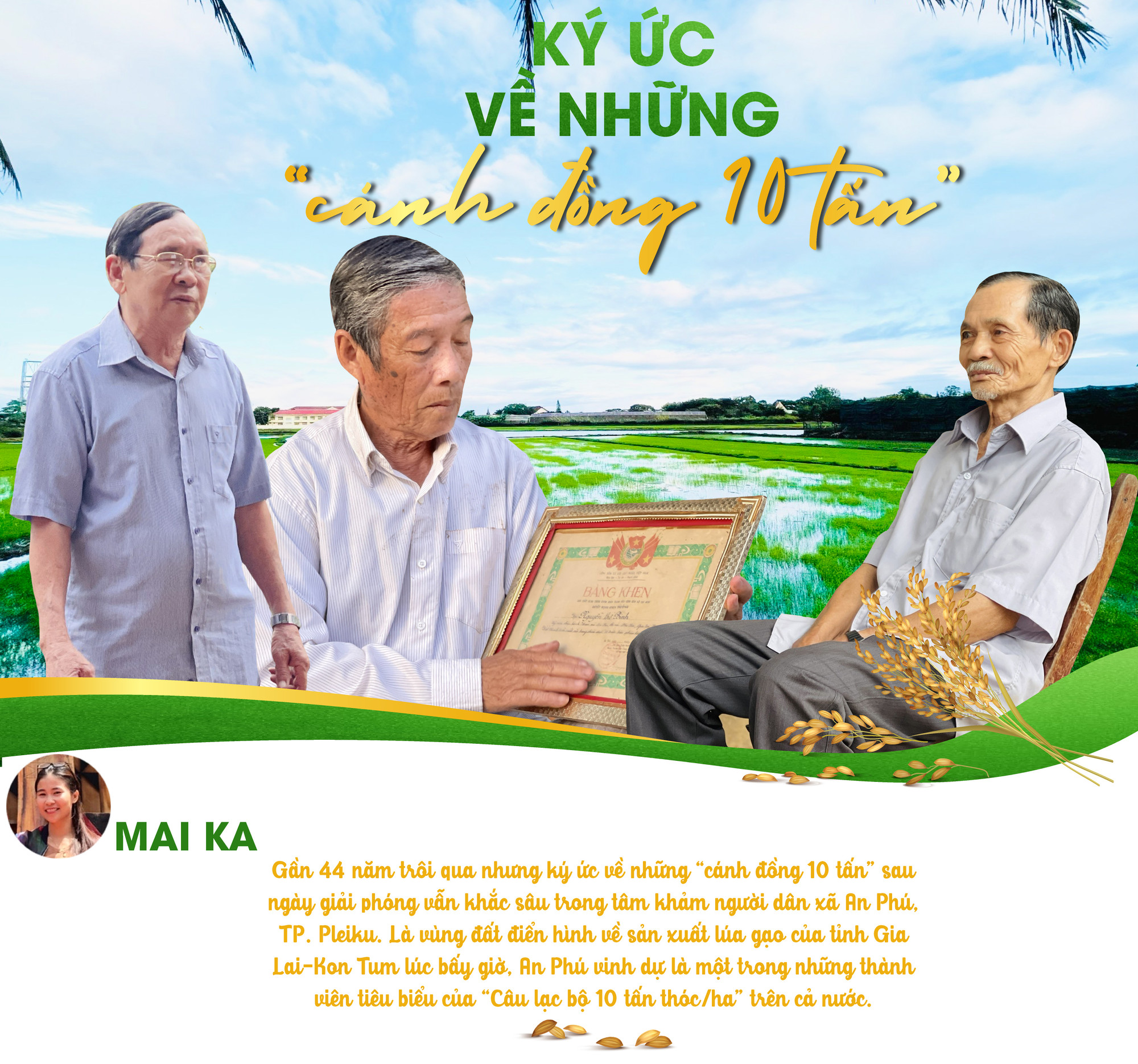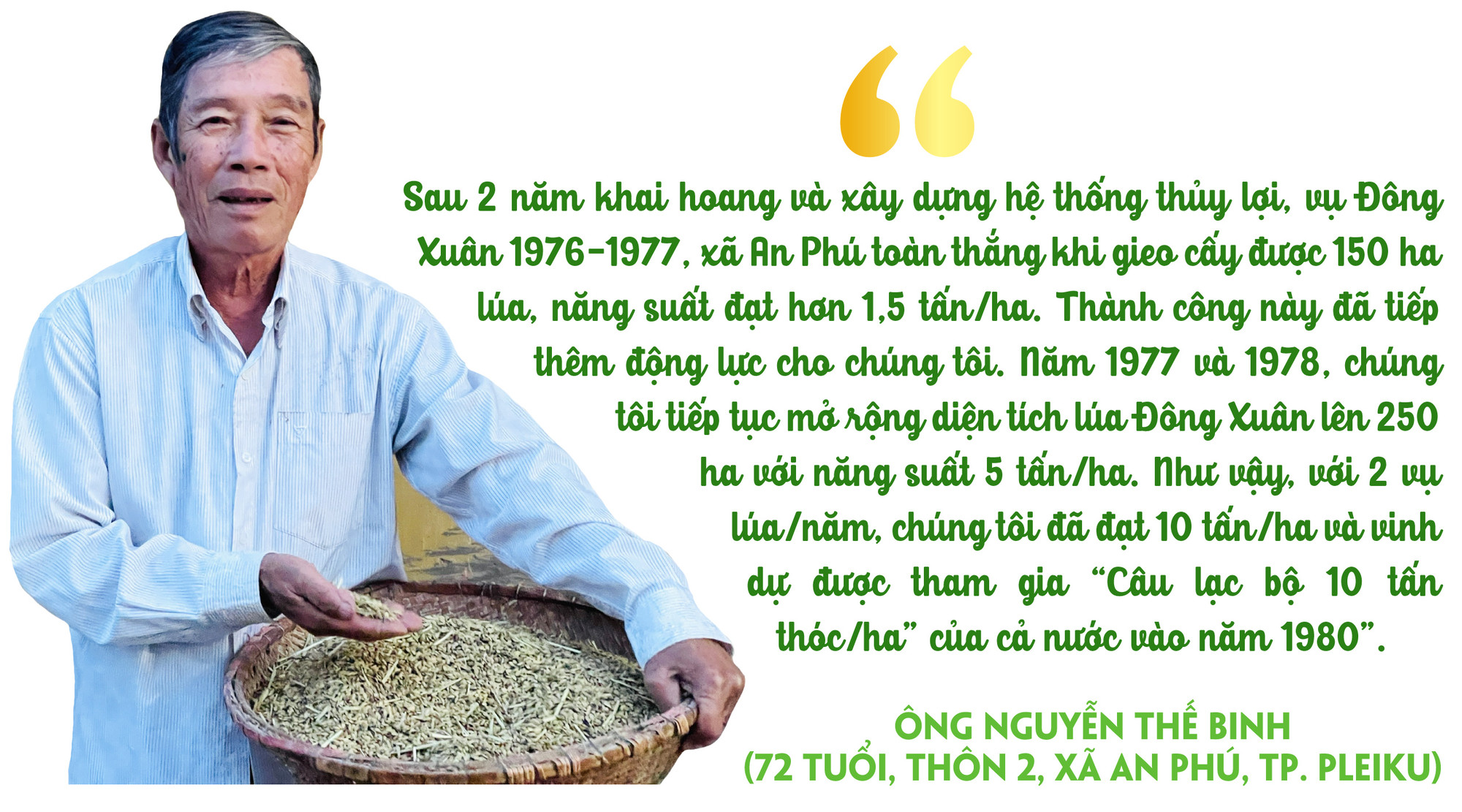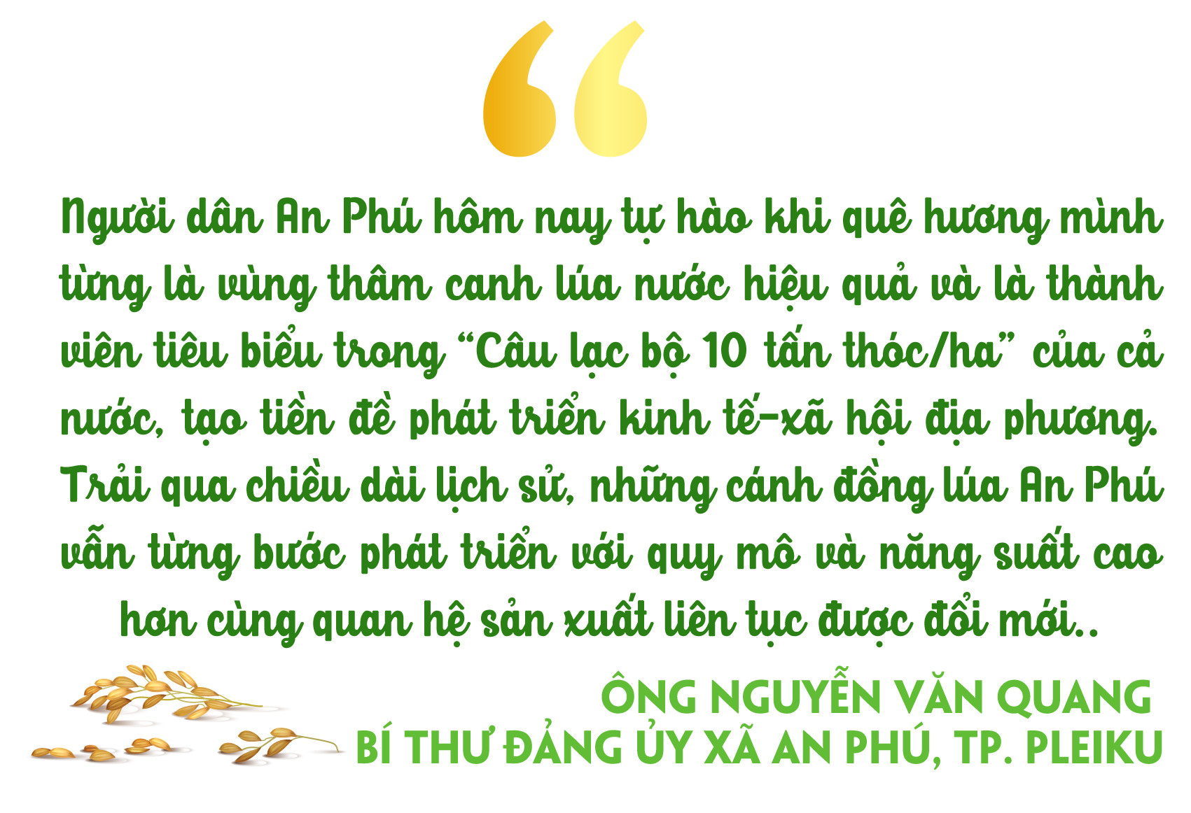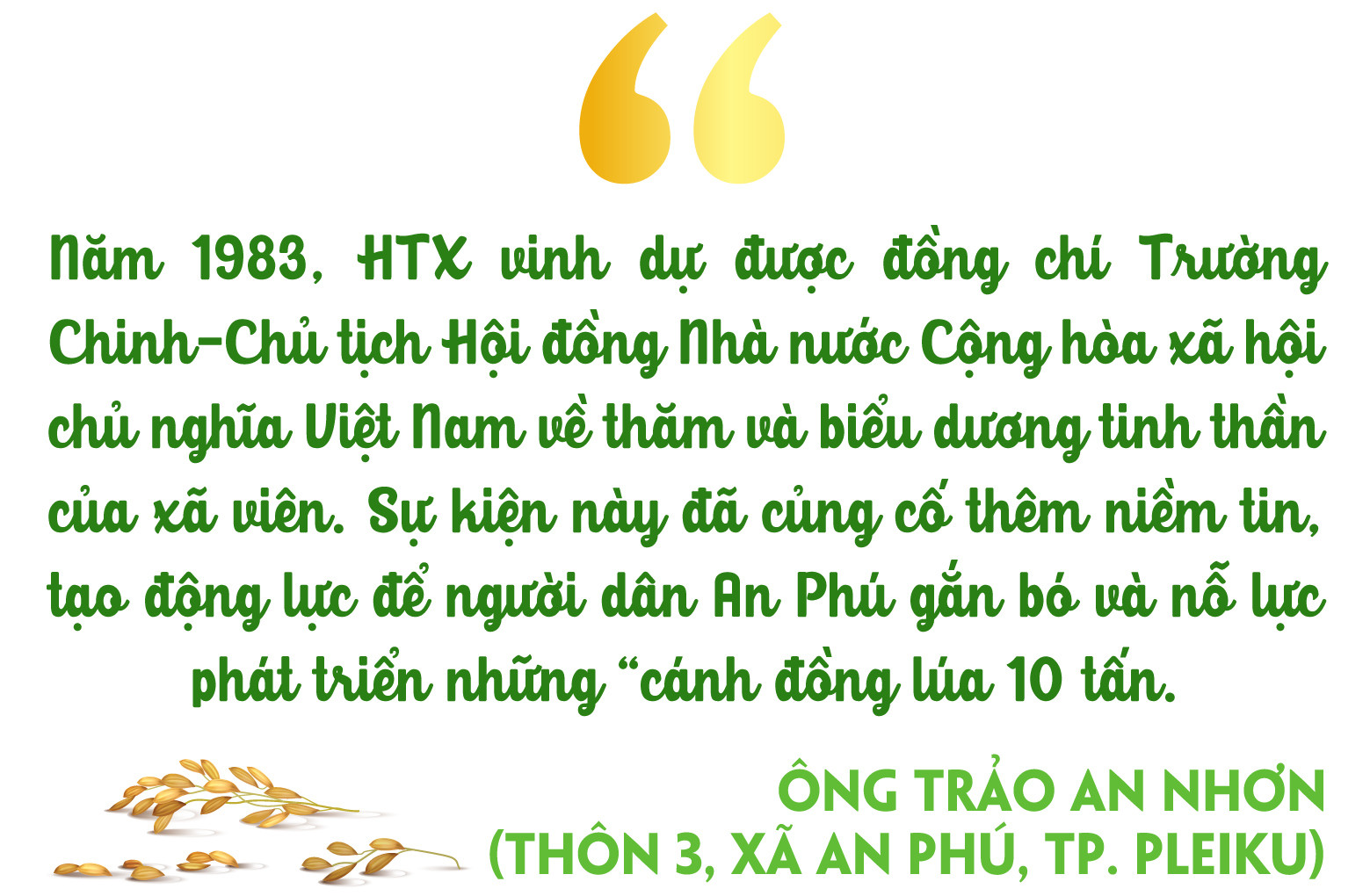 Đưa tay chỉ về cánh đồng lúa mướt xanh, ông Trần Thanh Vân (80 tuổi, thôn 3, xã An Phú) chia sẻ: “Là người trực tiếp tham gia khai hoang, làm thủy lợi và gieo cấy từ vụ lúa Đông Xuân đầu tiên của xã, khi nghe tin HTX của mình vinh dự là thành viên của “Câu lạc bộ 10 tấn thóc/ha”, tôi vỡ òa niềm vui. Chúng tôi xem HTX là gia đình thứ 2. Chúng tôi gắn bó và chung tay xây dựng nên những cánh đồng tốt tươi để luôn xứng đáng là lá cờ đầu về phát triển sản xuất toàn diện của tỉnh”. Cùng chung niềm tự hào, bà Trần Thị Năm (72 tuổi, thôn 1, xã An Phú) chia sẻ: “Ở xã An Phú, khi còn làm ăn cá thể có nhiều hộ thiếu đói. Nhưng từ khi vào HTX, các gia đình vừa đủ ăn vừa thực hiện được nghĩa vụ lương thực với Nhà nước và còn có lương thực đem bán để mua bò, dựng nhà mua sắm các đồ dùng cần thiết cho sinh hoạt. Lúc đó, HTX hoạt động vững chắc và chăm lo tốt cho đời sống xã viên. Chúng tôi cũng rất tự hào khi HTX luôn là điển hình về sản xuất nông nghiệp của thị xã Pleiku và của tỉnh Gia Lai-Kon Tum ngày ấy”.
