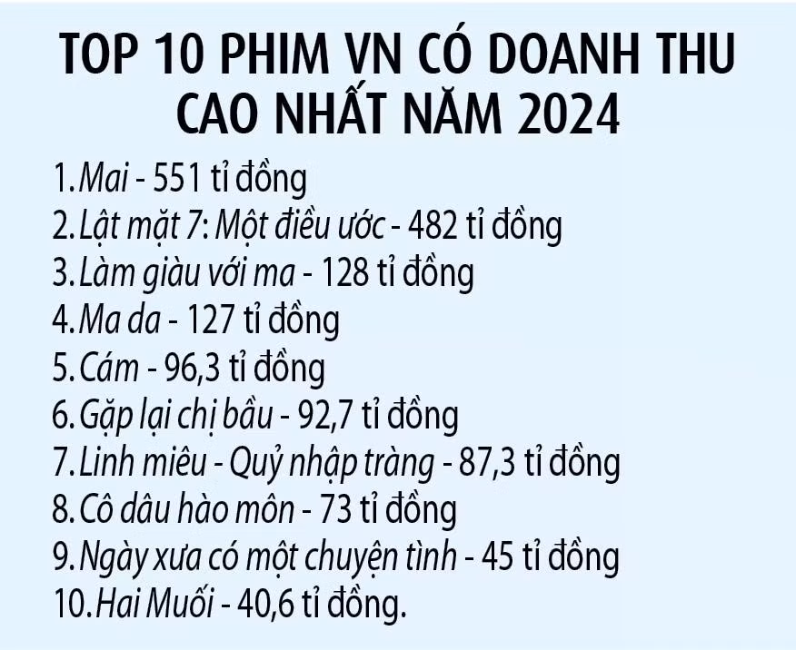 Theo Box Office Vietnam - đơn vị thống kê doanh số phòng vé độc lập, tổng doanh thu của thị trường phim chiếu rạp VN năm 2024 vượt mốc 4.600 tỉ đồng; riêng phim VN thu được khoảng 1.900 tỉ đồng, chiếm hơn 40%.