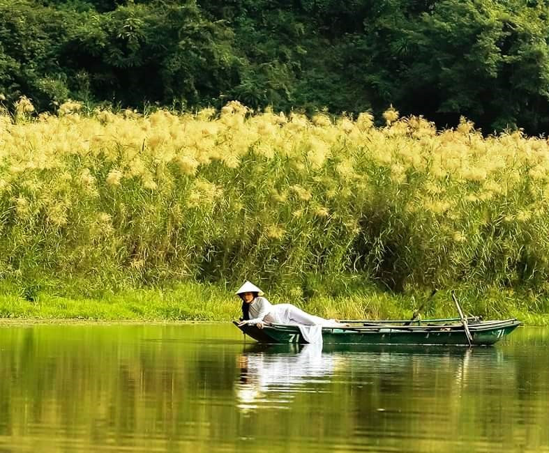 | Ngồi trên thuyền du khách vừa được thưởng ngoạn vể đẹp của Tràng An vừa được ngắm những rừng lau đẹp hút hồn. Ảnh: MĐ |