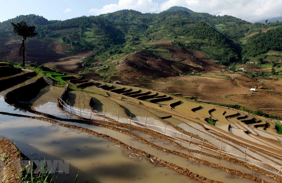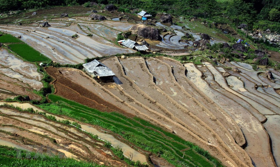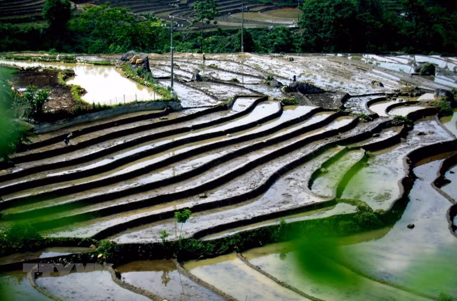 Những cơn mưa lớn mang dòng nước nguồn từ trên các ngọn núi đổ xuống những ruộng bậc thang tạo thành những vệt màu đa sắc, càng làm sống động bức tranh bình dị của xã Tà Lèng, huyện Tam Đường, tỉnh Lai Châu.