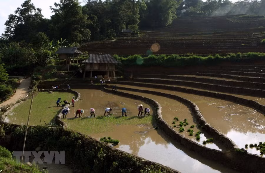 Người dân tập trung cấy trên những cánh đồng đã đầy no nước trời tại xã Tả Lèng, huyện Tam Đường, tỉnh Lai Châu.