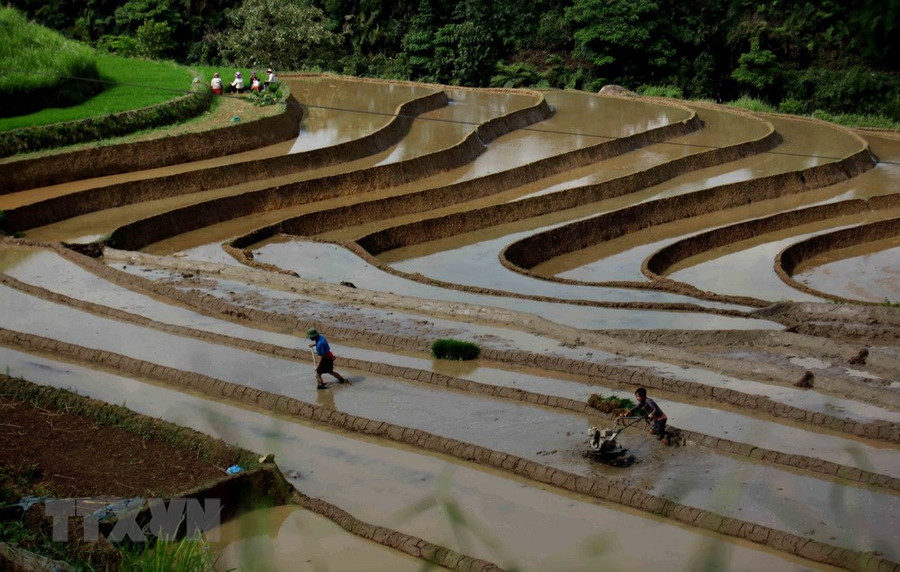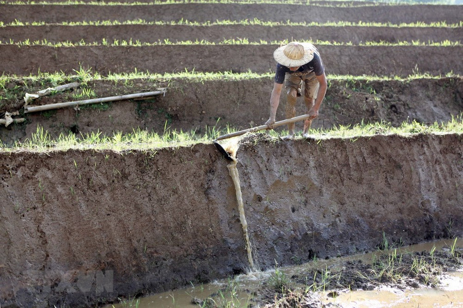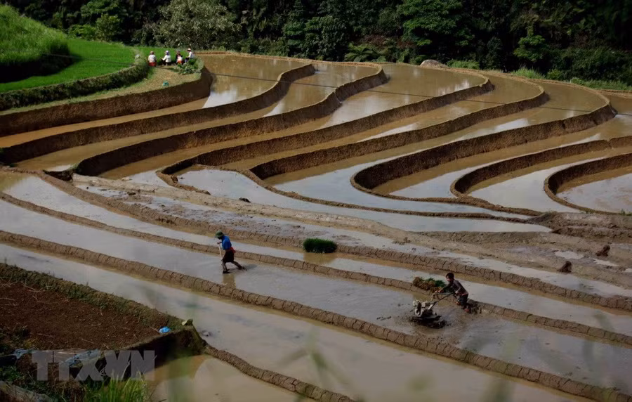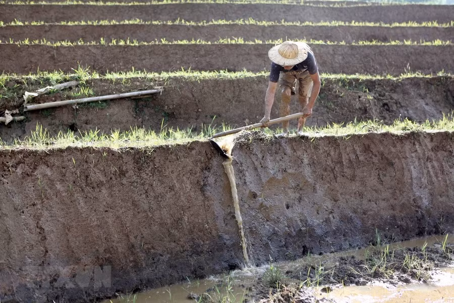 Người dân lấy nước vào ruộng chuẩn bị cho vụ lúa mới tại xã Tả Lèng, huyện Tam Đường tỉnh Lai Châu.
