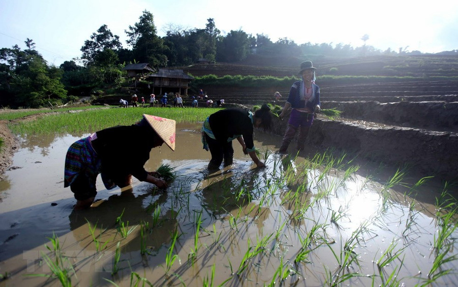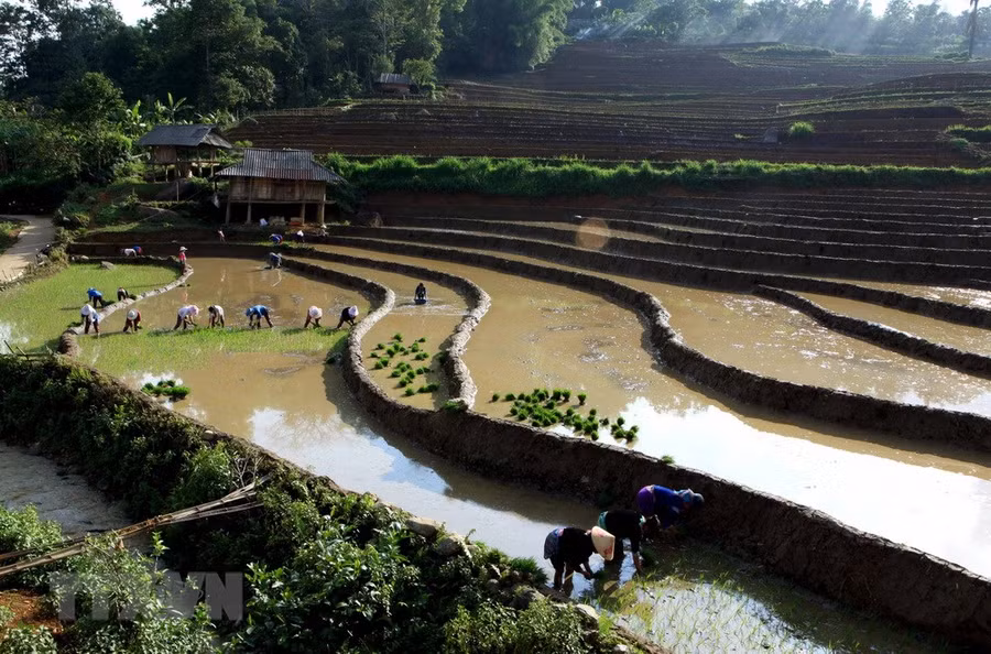 Người dân tập trung cấy trên những cánh đồng đã đầy no nước trời tại xã Tả Lèng huyện Tam Đường tỉnh Lai Châu.