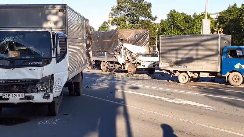 Tại hiện trường, đầu chiếc xe biển 61C–220.34 biến dạng, 2 xe ô tô tải bị tông nát phần đuôi. May mắn, vào thời điểm xảy ra tai nạn trên làn xe máy không có người hay phương tiện nào.