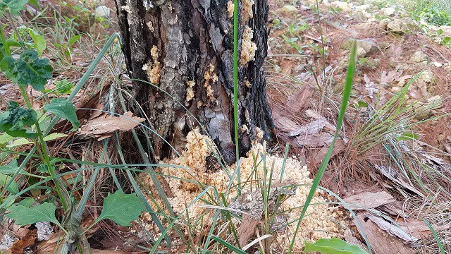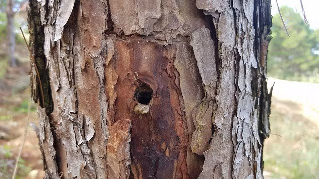 Một gốc thông bị khoan lỗ đổ thuốc diệt cỏ đầu độc.