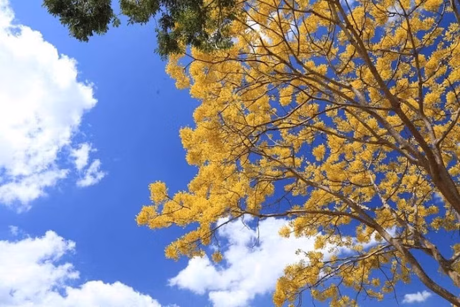 | Sắc vàng rực rỡ của cây phượng dưới ánh nắng hanh hao của mùa đông. |