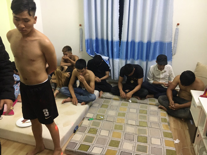 | Lúc 0 giờ ngày 25.4 Công an huyện Lâm Hà phối hợp Công an xã Tân Thanh (Lâm Hà) kiểm tra hành chính nhà ông Hoàng Minh Tân (29 tuổi), ở thôn Tân An, xã Tân Thanh phát hiện 11 nam nữ thanh niên tụ tập, có hành vi sử dụng ma túy trái phép. Hoàng Minh Tân (đứng) cùng nhóm thanh niên sử dụng ma tuý bị bắt quả tang. ẢNH: LÂM VIÊN Tại một phòng ngủ, cơ quan chức năng thu giữ 1 gói ni lông chứa tinh thể màu trắng nghi là ma túy, 1 gói ni lông khác chứa hai viên màu hồng nghi là ma túy tổng hợp, cùng “đồ nghề” để chơi ma túy. Rạng sáng cùng ngày (25.4), 11 nam nữ thanh niên được đưa về trụ sở công an để phân loại, tiếp tục điều tra làm rõ vụ việc. |