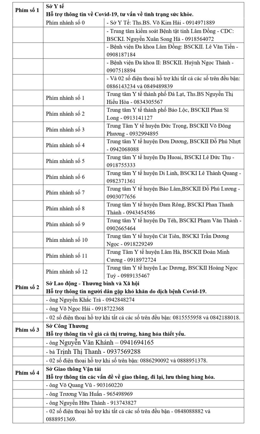 Cụ thể về y tế, hỗ trợ thông tin, tư vấn tình trạng sức khỏe; lĩnh vực lao động - thương binh và xã hội, phản ánh việc hỗ trợ người dân gặp khó khăn do dịch Covid-19; lĩnh vực công thương, phản ánh về giá cả thị trường, hàng hóa thiết yếu; lĩnh vực giao thông vận tải, phản ánh các vấn đề về giao thông, đi lại, lưu thông hàng hóa trên địa bàn tỉnh Lâm Đồng.