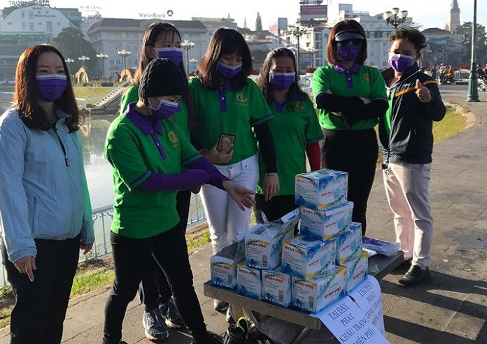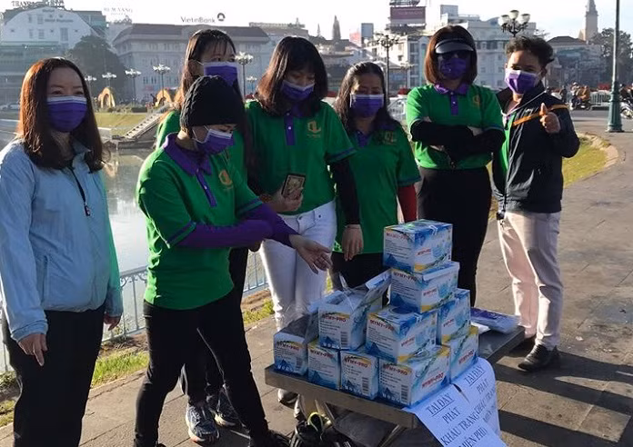 Một số bạn trẻ phát khẩu trang miễn phí tại bờ hồ Xuân Hương.