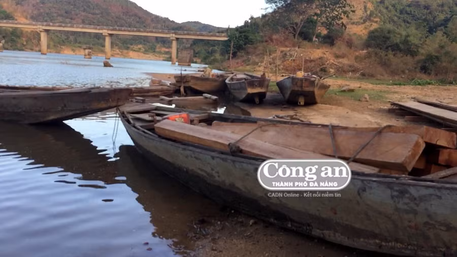 Thuyền chở gỗ lậu tập kết tại một bến thuyền bên bờ sông Sê San (địa phận xã Ia Kreng, H. Chư Păh, Gia Lai).