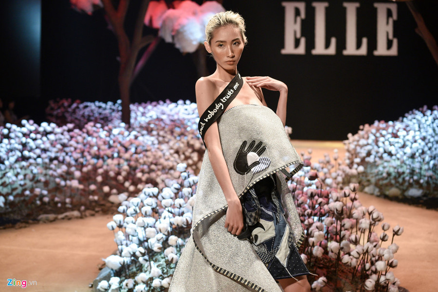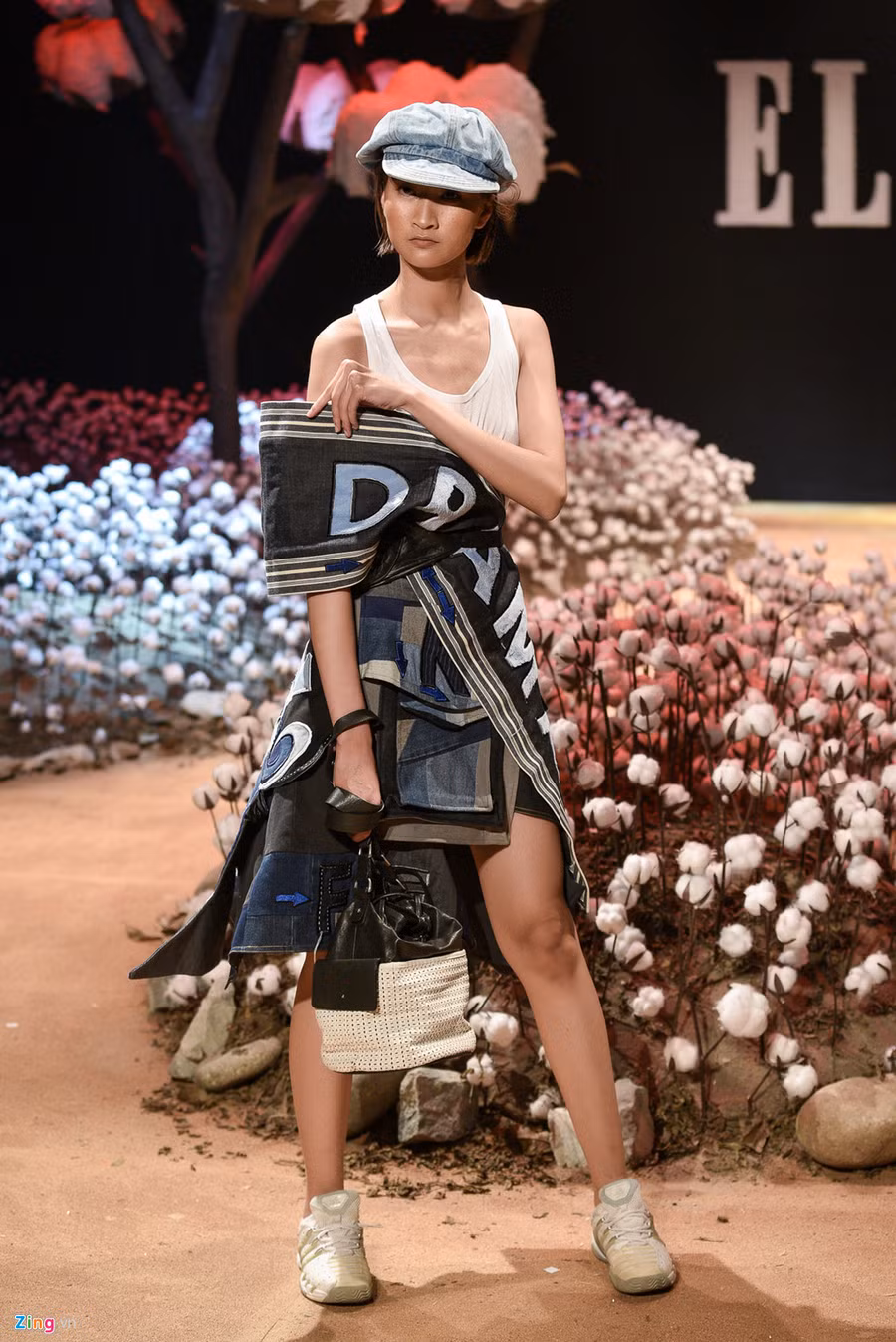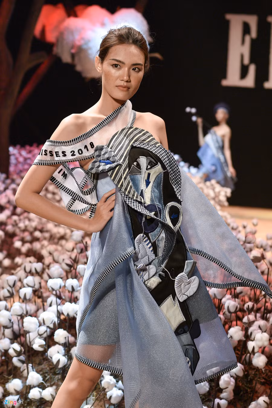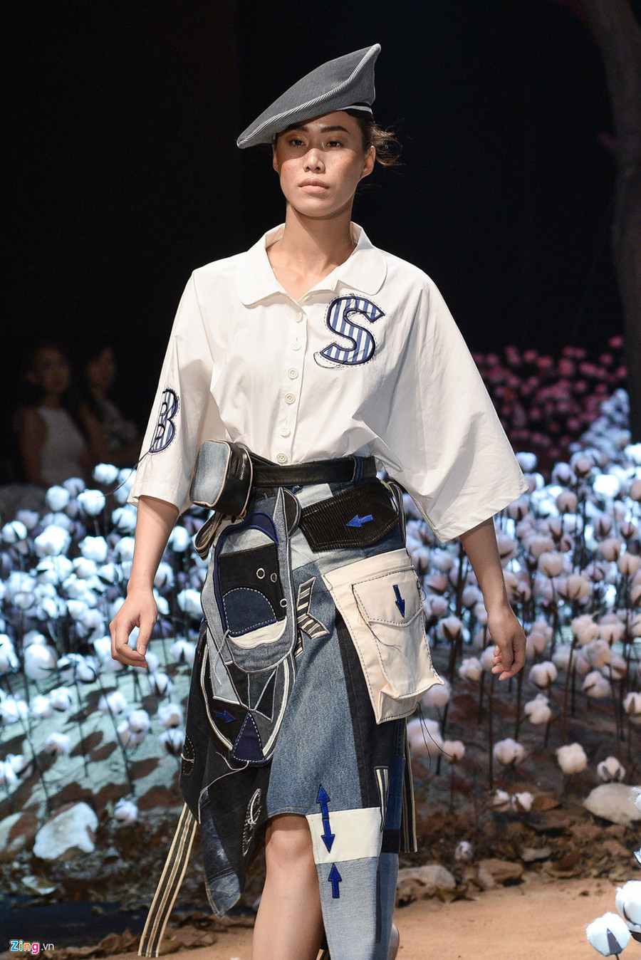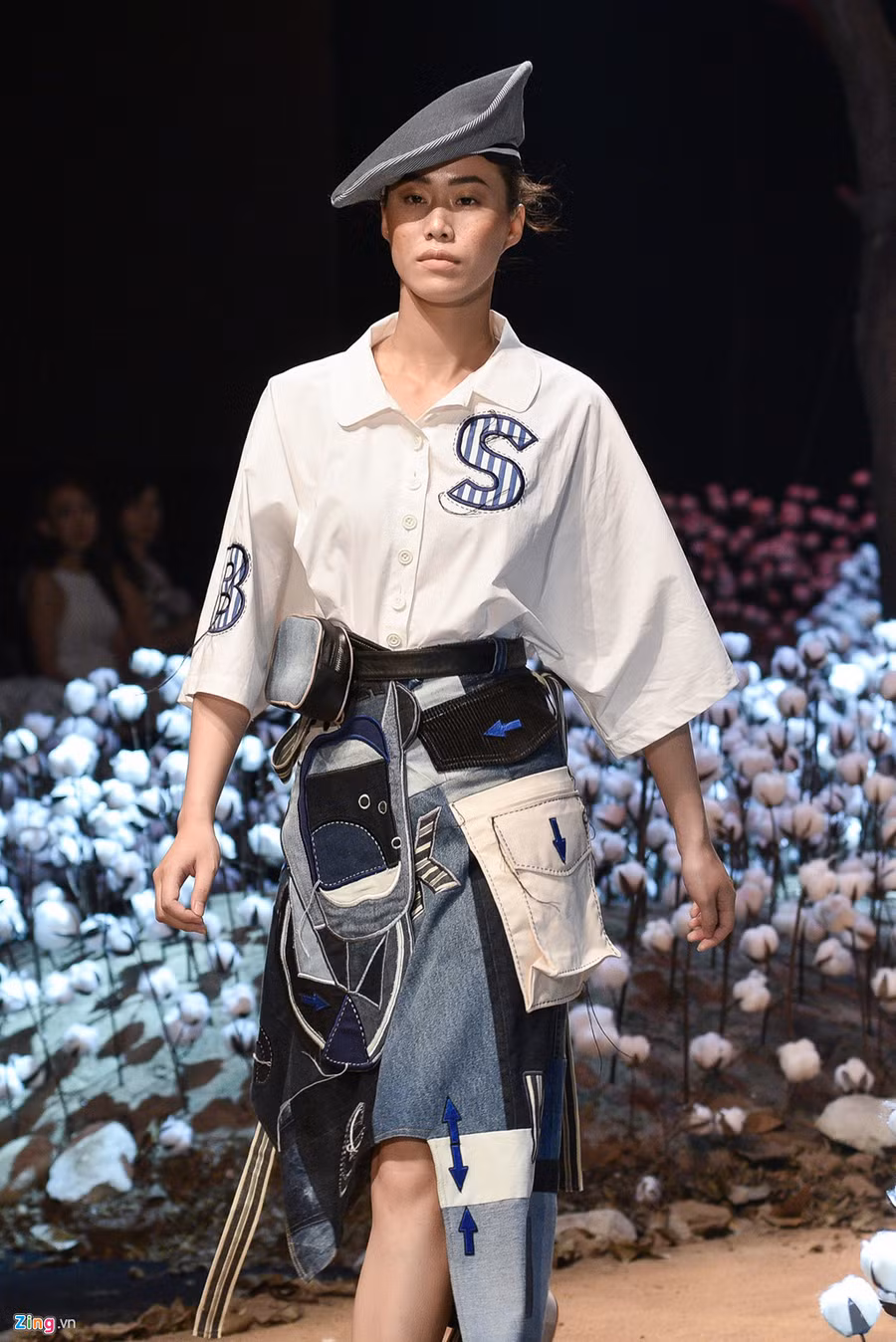 Với chủ đề Thời trang bền vững, nhà thiết kế tái chế chất liệu denim cùng nhiều màu sắc khác nhau nhằm tạo nên các sản phẩm độc đáo.