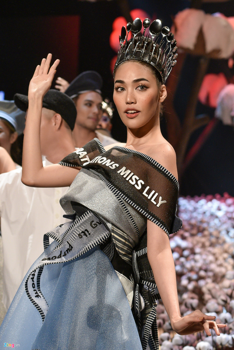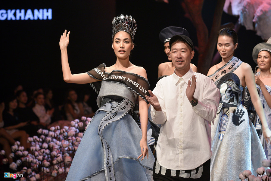 Lan Khuê đăng quang ngôi vị "Hoa hậu" trong show diễn của Võ Công Khanh. Cô diện trang phục chắp vá từ nhiều mảnh vải organza, cùng những dòng chữ được thêu tay độc đáo.
