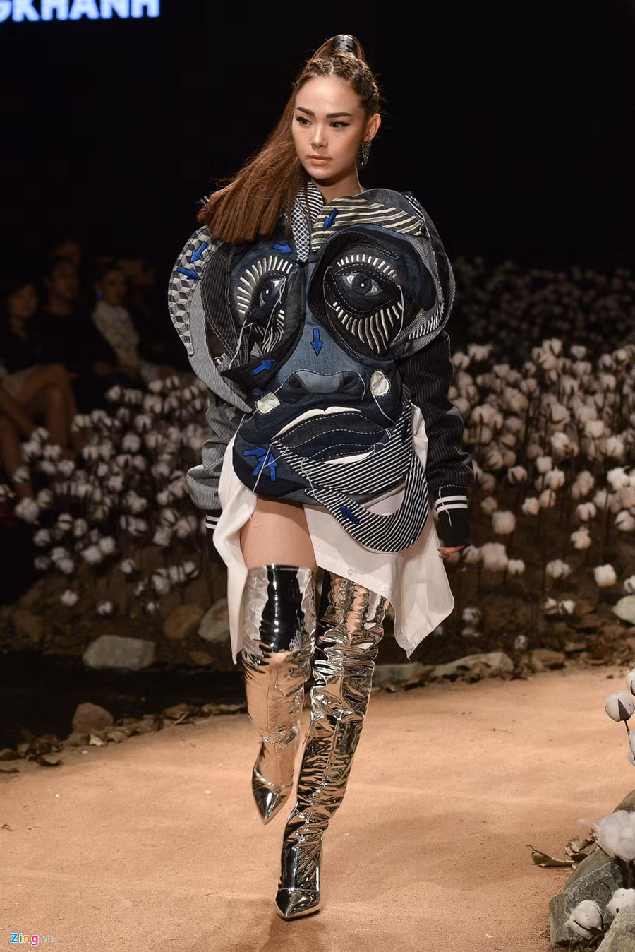 Đi theo chủ đề Thời trang bền vững, NTK Võ Công Khanh đã mang đến giới mộ điệu hình ảnh những cô gái cá tính trong trang phụ được chấp vá khéo léo từ chất liệu vải denim. Minh Hằng mở màn show diễn với bộ trang phục lạ mắt cùng biểu cảm sắc lạnh.